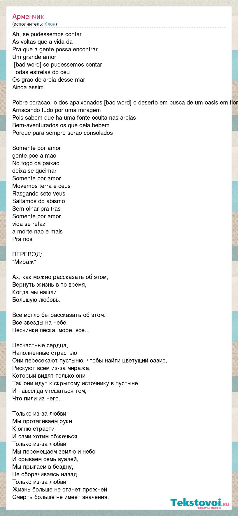 Ah, se pudessemos contar As voltas que a vida da Pra que a gente possa encontrar Um grande amor como se pudessemos contar Todas estrelas do ceu Os grao de areia desse mar Ainda assim Pobre coracao, o dos apaixonados Cruzam o deserto em busca de um oasis em flor Arriscando tudo por uma miragem Pois sabem que ha uma fonte oculta nas areias Bem-aventurados os que dela bebem Porque para sempre serao consolados Somente por amor gente poe a mao No fogo da paixao deixa se queimar Somente por amor Movemos terra e ceus Rasgando sete veus Saltamos do abismo Sem olhar pra tras Somente por amor vida se refaz a morte nao e mais Pra nos ПЕРЕВОД: "Мираж" Ах, как можно рассказать об этом, Вернуть жизнь в то время, Когда мы нашли Большую любовь. Все могло бы рассказать об этом: Все звезды на небе, Песчинки песка, море, все... Несчастные сердца, Наполненные страстью Они пересекают пустыню, чтобы найти цветущий оазис, Рискуют всем из-за миража, Который видят только они Так они идут к скрытому источнику в пустыне, И навсегда утешаться тем, Что пили из него. Только из-за любви Мы протягиваем руки К огню страсти И сами хотим обжечься Только из-за любви Мы перемещаем землю и небо И срываем семь вуалей, Мы прыгаем в бездну, Не оборачиваясь назад, Только из-за любви Жизнь больше не станет прежней Смерть больше не имеет значения.