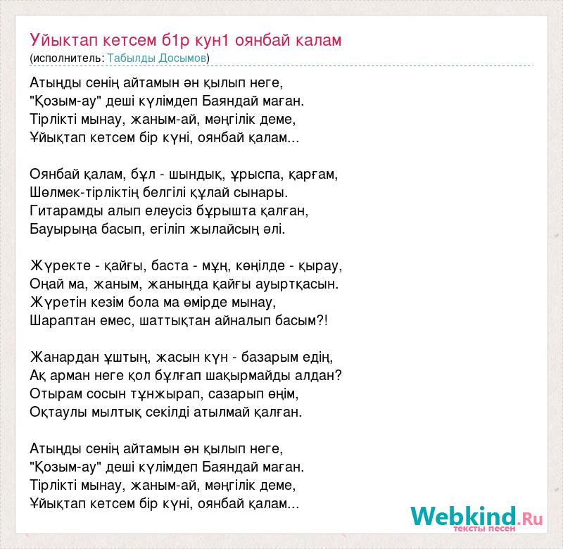 Атыңды сенің айтамын ән қылып неге, "Қозым-ау" деші күлімдеп Баяндай маған. Тірлікті мынау, жаным-ай, мәңгілік деме, Ұйықтап кетсем бір күні, оянбай қалам... Оянбай қалам, бұл - шындық, ұрыспа, қарғам, Шөлмек-тірліктің белгілі құлай сынары. Гитарамды алып елеусіз бұрышта қалған, Бауырыңа басып, егіліп жылайсың әлі. Жүректе - қайғы, баста - мұң, көңілде - қырау, Оңай ма, жаным, жаныңда қайғы ауыртқасын. Жүретін кезім бола ма өмірде мынау, Шараптан емес, шаттықтан айналып басым?! Жанардан ұштың, жасын күн - базарым едің, Ақ арман неге қол бұлғап шақырмайды алдан? Отырам сосын тұнжырап, сазарып өңім, Оқтаулы мылтық секілді атылмай қалған. Атыңды сенің айтамын ән қылып неге, "Қозым-ау" деші күлімдеп Баяндай маған. Тірлікті мынау, жаным-ай, мәңгілік деме, Ұйықтап кетсем бір күні, оянбай қалам...