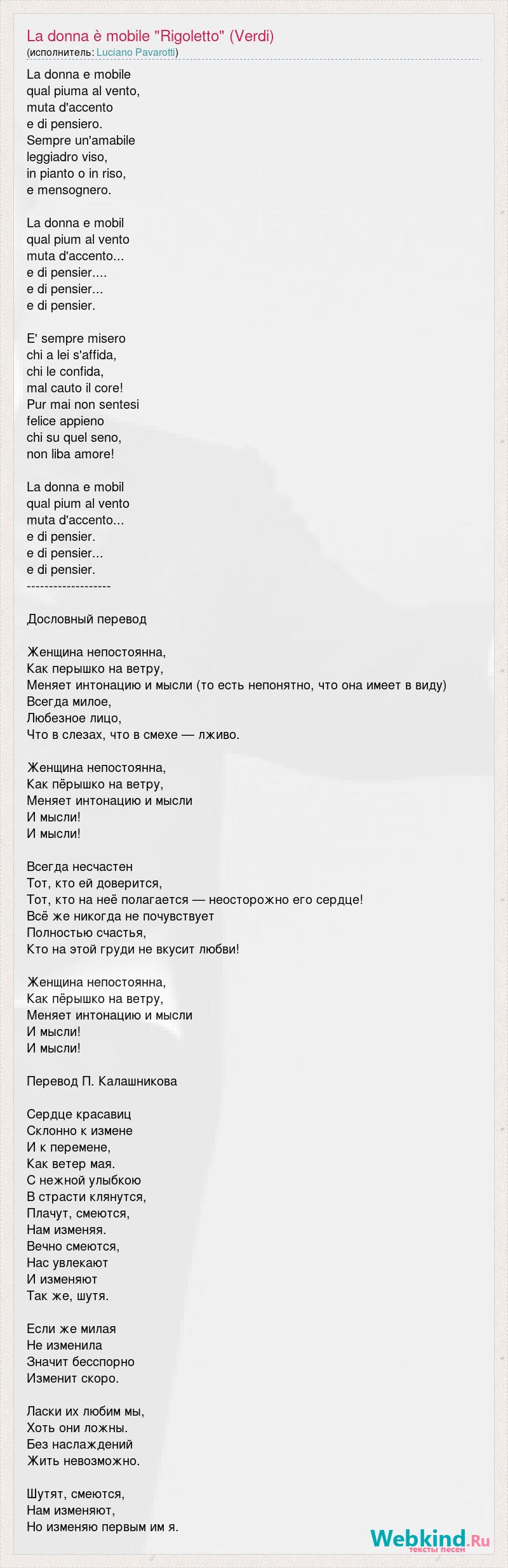 La donna e mobile qual piuma al vento, muta d'accento e di pensiero. Sempre un'amabile leggiadro viso, in pianto o in riso, e mensognero. La donna e mobil qual pium al vento muta d'accento... e di pensier.... e di pensier... e di pensier. E' sempre misero chi a lei s'affida, chi le confida, mal cauto il core! Pur mai non sentesi felice appieno chi su quel seno, non liba amore! La donna e mobil qual pium al vento muta d'accento... e di pensier. e di pensier... e di pensier. ------------------- Дословный перевод Женщина непостоянна, Как перышко на ветру, Меняет интонацию и мысли (то есть непонятно, что она имеет в виду) Всегда милое, Любезное лицо, Что в слезах, что в смехе — лживо. Женщина непостоянна, Как пёрышко на ветру, Меняет интонацию и мысли И мысли! И мысли! Всегда несчастен Тот, кто ей доверится, Тот, кто на неё полагается — неосторожно его сердце! Всё же никогда не почувствует Полностью счастья, Кто на этой груди не вкусит любви! Женщина непостоянна, Как пёрышко на ветру, Меняет интонацию и мысли И мысли! И мысли! Перевод П. Калашникова Сердце красавиц Склонно к измене И к перемене, Как ветер мая. С нежной улыбкою В страсти клянутся, Плачут, смеются, Нам изменяя. Вечно смеются, Нас увлекают И изменяют Так же, шутя. Если же милая Не изменила Значит бесспорно Изменит скоро. Ласки их любим мы, Хоть они ложны. Без наслаждений Жить невозможно. Шутят, смеются, Нам изменяют, Но изменяю первым им я.