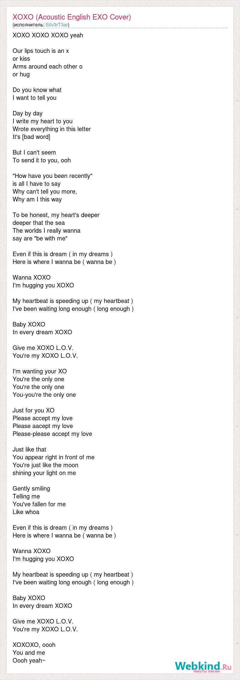 XOXO XOXO XOXO yeah Our lips touch is an x or kiss Arms around each other o or hug Do you know what I want to tell you Day by day I write my heart to you Wrote everything in this letter It's [bad word] But I can't seem To send it to you, ooh "How have you been recently" is all I have to say Why can't tell you more, Why am I this way To be honest, my heart's deeper deeper that the sea The worlds I really wanna say are "be with me" Even if this is dream ( in my dreams ) Here is where I wanna be ( wanna be ) Wanna XOXO I'm hugging you XOXO My heartbeat is speeding up ( my heartbeat ) I've been waiting long enough ( long enough ) Baby XOXO In every dream XOXO Give me XOXO L.O.V. You're my XOXO L.O.V. I'm wanting your XO You're the only one You're the only one You-you're the only one Just for you XO Please accept my love Please aacept my love Please-please accept my love Just like that You appear right in front of me You're just like the moon shining your light on me Gently smiling Telling me You've fallen for me Like whoa Even if this is dream ( in my dreams ) Here is where I wanna be ( wanna be ) Wanna XOXO I'm hugging you XOXO My heartbeat is speeding up ( my heartbeat ) I've been waiting long enough ( long enough ) Baby XOXO In every dream XOXO Give me XOXO L.O.V. You're my XOXO L.O.V. XOXOXO, oooh You and me Oooh yeah~