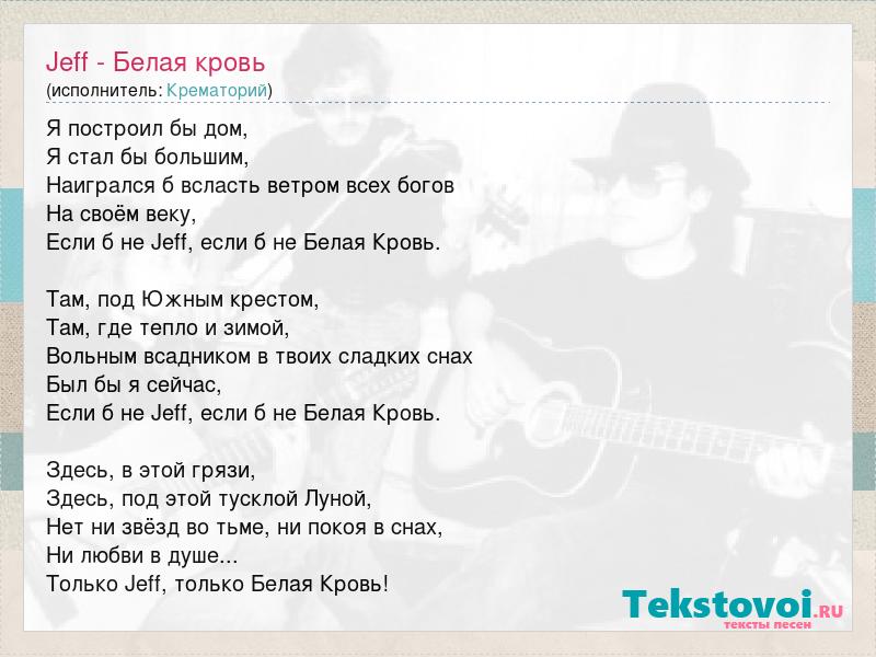 Я построил бы дом, Я стал бы большим, Наигрался б всласть ветром всех богов На своём веку, Если б не Jeff, если б не Белая Кровь. Там, под Южным крестом, Там, где тепло и зимой, Вольным всадником в твоих сладких снах Был бы я сейчас, Если б не Jeff, если б не Белая Кровь. Здесь, в этой грязи, Здесь, под этой тусклой Луной, Нет ни звёзд во тьме, ни покоя в снах, Ни любви в душе... Только Jeff, только Белая Кровь!