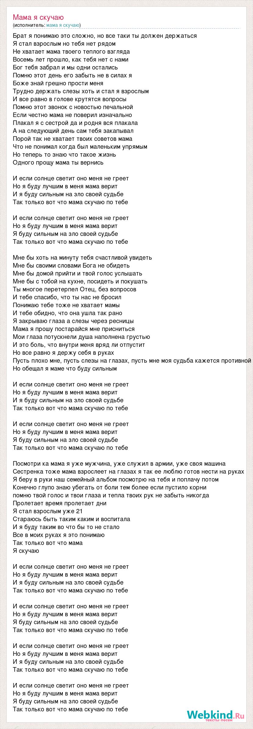 Брат я понимаю это сложно, но все таки ты должен держаться Я стал взрослым но тебя нет рядом Не хватает мама твоего теплого взгляда Восемь лет прошло, как тебя нет с нами Бог тебя забрал и мы одни остались Помню этот день его забыть не в силах я Боже знай грешно прости меня Трудно держать слезы хоть и стал я взрослым И все равно в голове крутятся вопросы Помню этот звонок с новостью печальной Если честно мама не поверил изначально Плакал я с сестрой да и родня вся плакала А на следующий день сам тебя закапывал Порой так не хватает твоих советов мама Что не понимал когда был маленьким упрямым Но теперь то знаю что такое жизнь Одного прощу мама ты вернись И если солнце светит оно меня не греет Но я буду лучшим в меня мама верит И я буду сильным на зло своей судьбе Так только вот что мама скучаю по тебе И если солнце светит оно меня не греет Но я буду лучшим в меня мама верит Я буду сильным на зло своей судьбе Так только вот что мама скучаю по тебе Мне бы хоть на минуту тебя счастливой увидеть Мне бы своими словами Бога не обидеть Мне бы домой прийти и твой голос услышать Мне бы с тобой на кухне, посидеть и покушать Ты многое перетерпел Отец, без вопросов И тебе спасибо, что ты нас не бросил Понимаю тебе тоже не хватает мамы И тебе обидно, что она ушла так рано Я закрываю глаза а слезы через ресницы Мама я прошу постарайся мне присниться Мои глаза потускнели душа наполнена грустью И это боль, что внутри меня вряд ли отпустит Но все равно я держу себя в руках Пусть плохо мне, пусть слезы на глазах, пусть мне моя судьба кажется противной Но обещал я маме что буду сильным И если солнце светит оно меня не греет Но я буду лучшим в меня мама верит И я буду сильным на зло своей судьбе Так только вот что мама скучаю по тебе И если солнце светит оно меня не греет Но я буду лучшим в меня мама верит Я буду сильным на зло своей судьбе Так только вот что мама скучаю по тебе Посмотри ка мама я уже мужчина, уже служил в армии, уже своя машина Сестренка тоже мама взрослеет на глазах я так ее люблю готов нести на руках Я беру в руки наш семейный альбом посмотрю на тебя и поплачу потом Конечно глупо знаю убегать от боли тем более если пустило корни помню твой голос и твои глаза и тепла твоих рук не забыть никогда Пролетает время пролетает дни Я стал взрослым уже 21 Стараюсь быть таким каким и воспитала И я буду таким во что бы то не стало Все в моих руках я это понимаю Так только вот что мама Я скучаю И если солнце светит оно меня не греет Но я буду лучшим в меня мама верит И я буду сильным на зло своей судьбе Так только вот что мама скучаю по тебе И если солнце светит оно меня не греет Но я буду лучшим в меня мама верит Я буду сильным на зло своей судьбе Так только вот что мама скучаю по тебе И если солнце светит оно меня не греет Но я буду лучшим в меня мама верит И я буду сильным на зло своей судьбе Так только вот что мама скучаю по тебе И если солнце светит оно меня не греет Но я буду лучшим в меня мама верит Я буду сильным на зло своей судьбе Так только вот что мама скучаю по тебе