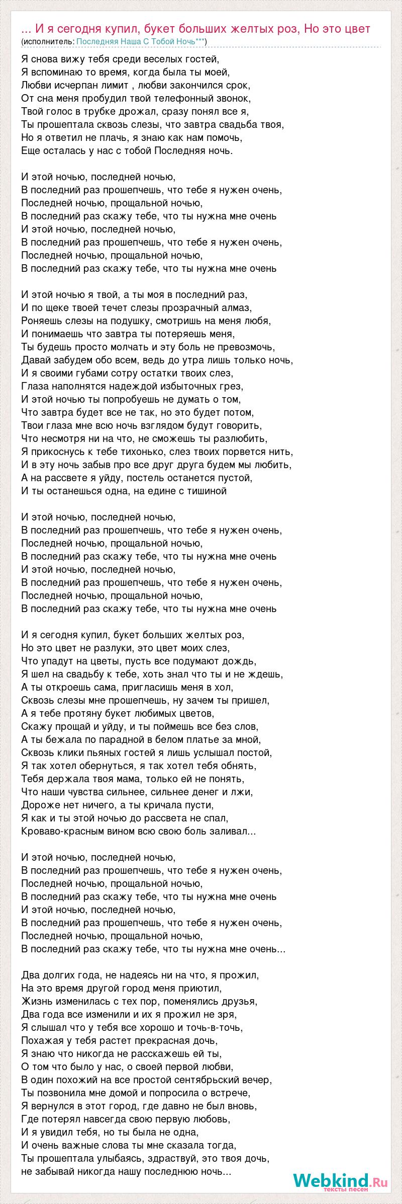 Я снова вижу тебя среди веселых гостей, Я вспоминаю то время, когда была ты моей, Любви исчерпан лимит , любви закончился срок, От сна меня пробудил твой телефонный звонок, Твой голос в трубке дрожал, сразу понял все я, Ты прошептала сквозь слезы, что завтра свадьба твоя, Но я ответил не плачь, я знаю как нам помочь, Еще осталась у нас с тобой Последняя ночь. И этой ночью, последней ночью, В последний раз прошепчешь, что тебе я нужен очень, Последней ночью, прощальной ночью, В последний раз скажу тебе, что ты нужна мне очень И этой ночью, последней ночью, В последний раз прошепчешь, что тебе я нужен очень, Последней ночью, прощальной ночью, В последний раз скажу тебе, что ты нужна мне очень И этой ночью я твой, а ты моя в последний раз, И по щеке твоей течет слезы прозрачный алмаз, Роняешь слезы на подушку, смотришь на меня любя, И понимаешь что завтра ты потеряешь меня, Ты будешь просто молчать и эту боль не превозмочь, Давай забудем обо всем, ведь до утра лишь только ночь, И я своими губами сотру остатки твоих слез, Глаза наполнятся надеждой избыточных грез, И этой ночью ты попробуешь не думать о том, Что завтра будет все не так, но это будет потом, Твои глаза мне всю ночь взглядом будут говорить, Что несмотря ни на что, не сможешь ты разлюбить, Я прикоснусь к тебе тихонько, слез твоих порвется нить, И в эту ночь забыв про все друг друга будем мы любить, А на рассвете я уйду, постель останется пустой, И ты останешься одна, на едине с тишиной И этой ночью, последней ночью, В последний раз прошепчешь, что тебе я нужен очень, Последней ночью, прощальной ночью, В последний раз скажу тебе, что ты нужна мне очень И этой ночью, последней ночью, В последний раз прошепчешь, что тебе я нужен очень, Последней ночью, прощальной ночью, В последний раз скажу тебе, что ты нужна мне очень И я сегодня купил, букет больших желтых роз, Но это цвет не разлуки, это цвет моих слез, Что упадут на цветы, пусть все подумают дождь, Я шел на свадьбу к тебе, хоть знал что ты и не ждешь, А ты откроешь сама, пригласишь меня в хол, Сквозь слезы мне прошепчешь, ну зачем ты пришел, А я тебе протяну букет любимых цветов, Скажу прощай и уйду, и ты поймешь все без слов, А ты бежала по парадной в белом платье за мной, Сквозь клики пьяных гостей я лишь услышал постой, Я так хотел обернуться, я так хотел тебя обнять, Тебя держала твоя мама, только ей не понять, Что наши чувства сильнее, сильнее денег и лжи, Дороже нет ничего, а ты кричала пусти, Я как и ты этой ночью до рассвета не спал, Кроваво-красным вином всю свою боль заливал... И этой ночью, последней ночью, В последний раз прошепчешь, что тебе я нужен очень, Последней ночью, прощальной ночью, В последний раз скажу тебе, что ты нужна мне очень И этой ночью, последней ночью, В последний раз прошепчешь, что тебе я нужен очень, Последней ночью, прощальной ночью, В последний раз скажу тебе, что ты нужна мне очень... Два долгих года, не надеясь ни на что, я прожил, На это время другой город меня приютил, Жизнь изменилась с тех пор, поменялись друзья, Два года все изменили и их я прожил не зря, Я слышал что у тебя все хорошо и точь-в-точь, Похажая у тебя растет прекрасная дочь, Я знаю что никогда не расскажешь ей ты, О том что было у нас, о своей первой любви, В один похожий на все простой сентябрьский вечер, Ты позвонила мне домой и попросила о встрече, Я вернулся в этот город, где давн