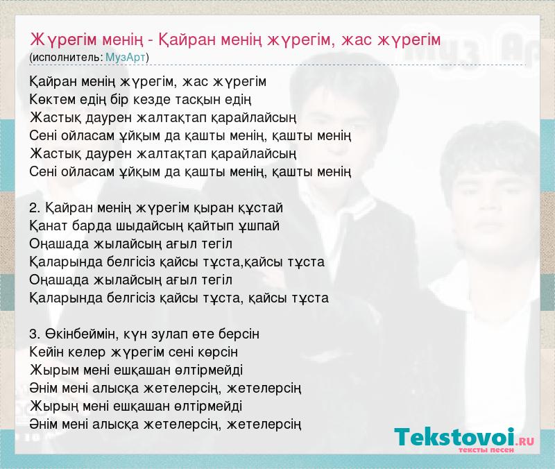 Қайран менің жүрегім, жас жүрегім Көктем едің бір кезде тасқын едің Жастық даурен жалтақтап қарайлайсың Сені ойласам ұйқым да қашты менің, қашты менің Жастық даурен жалтақтап қарайлайсың Сені ойласам ұйқым да қашты менің, қашты менің 2. Қайран менің жүрегім қыран құстай Қанат барда шыдайсың қайтып ұшпай Оңашада жылайсың ағыл тегіл Қаларында белгісіз қайсы тұста,қайсы тұста Оңашада жылайсың ағыл тегіл Қаларында белгісіз қайсы тұста, қайсы тұста 3. Өкінбеймін, күн зулап өте берсін Кейін келер жүрегім сені көрсін Жырым мені ешқашан өлтірмейді Әнім мені алысқа жетелерсің, жетелерсің Жырың мені ешқашан өлтірмейді Әнім мені алысқа жетелерсің, жетелерсің