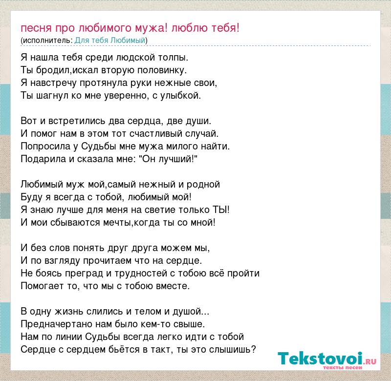 Я нашла тебя среди людской толпы. Ты бродил,искал вторую половинку. Я навстречу протянула руки нежные свои, Ты шагнул ко мне уверенно, с улыбкой. Вот и встретились два сердца, две души. И помог нам в этом тот счастливый случай. Попросила у Судьбы мне мужа милого найти. Подарила и сказала мне: "Он лучший!" Любимый муж мой,самый нежный и родной Буду я всегда с тобой, любимый мой! Я знаю лучше для меня на светие только ТЫ! И мои сбываются мечты,когда ты со мной! И без слов понять друг друга можем мы, И по взгляду прочитаем что на сердце. Не боясь преград и трудностей с тобою всё пройти Помогает то, что мы с тобою вместе. В одну жизнь слились и телом и душой... Предначертано нам было кем-то свыше. Нам по линии Судьбы всегда легко идти с тобой Сердце с сердцем бьётся в такт, ты это слышишь?