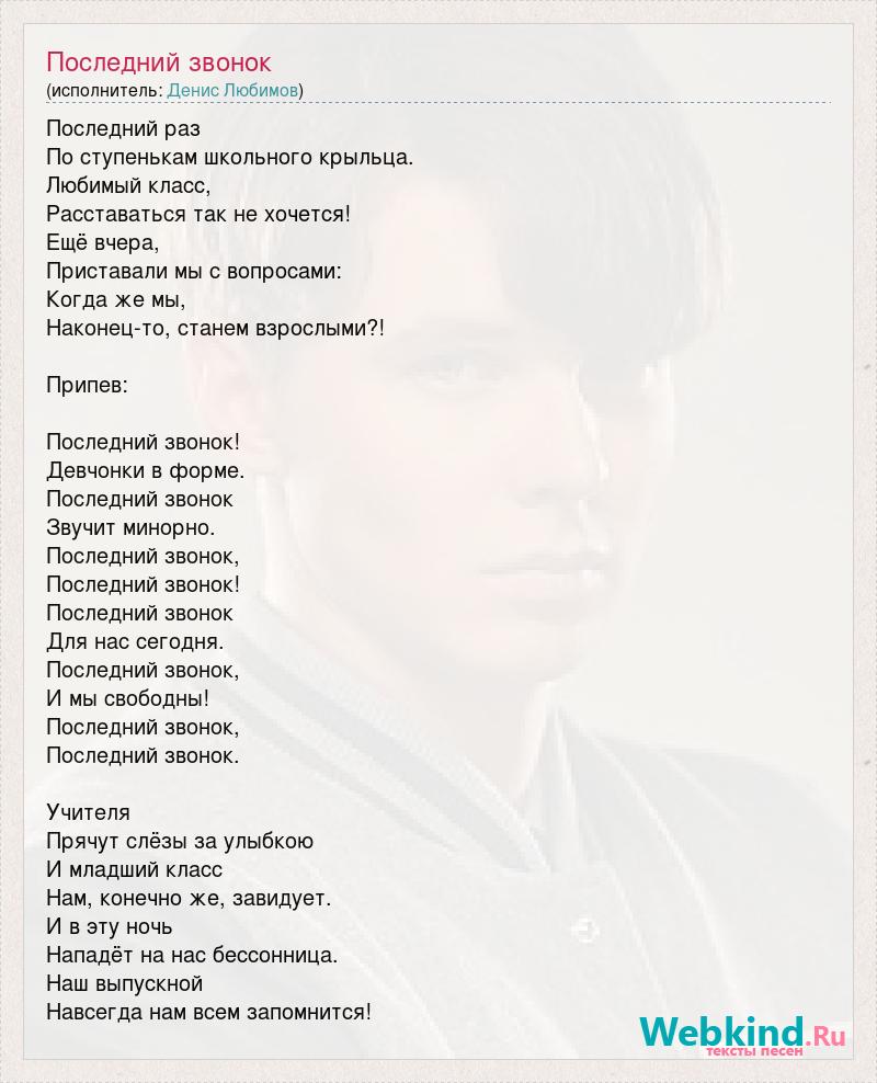 Последний раз По ступенькам школьного крыльца. Любимый класс, Расставаться так не хочется! Ещё вчера, Приставали мы с вопросами: Когда же мы, Наконец-то, станем взрослыми?! Припев: Последний звонок! Девчонки в форме. Последний звонок Звучит минорно. Последний звонок, Последний звонок! Последний звонок Для нас сегодня. Последний звонок, И мы свободны! Последний звонок, Последний звонок. Учителя Прячут слёзы за улыбкою И младший класс Нам, конечно же, завидует. И в эту ночь Нападёт на нас бессонница. Наш выпускной Навсегда нам всем запомнится!