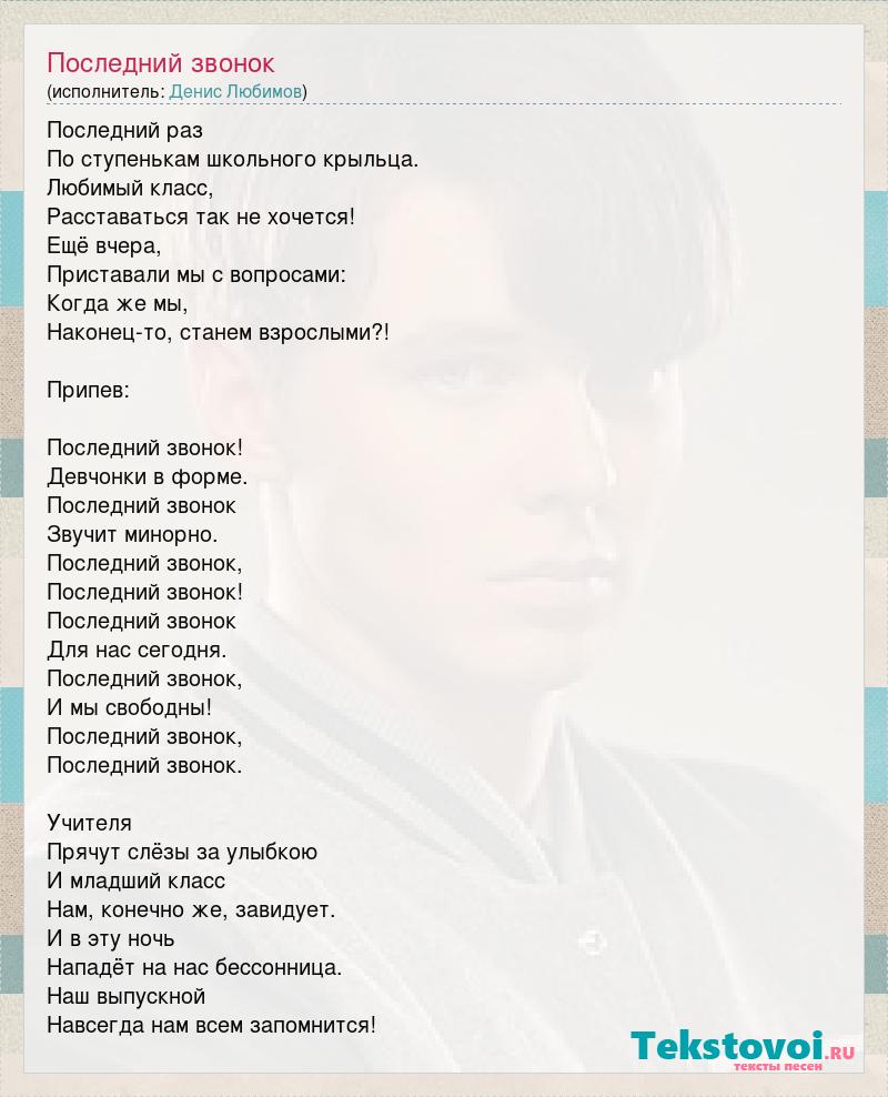 Последний раз По ступенькам школьного крыльца. Любимый класс, Расставаться так не хочется! Ещё вчера, Приставали мы с вопросами: Когда же мы, Наконец-то, станем взрослыми?! Припев: Последний звонок! Девчонки в форме. Последний звонок Звучит минорно. Последний звонок, Последний звонок! Последний звонок Для нас сегодня. Последний звонок, И мы свободны! Последний звонок, Последний звонок. Учителя Прячут слёзы за улыбкою И младший класс Нам, конечно же, завидует. И в эту ночь Нападёт на нас бессонница. Наш выпускной Навсегда нам всем запомнится!