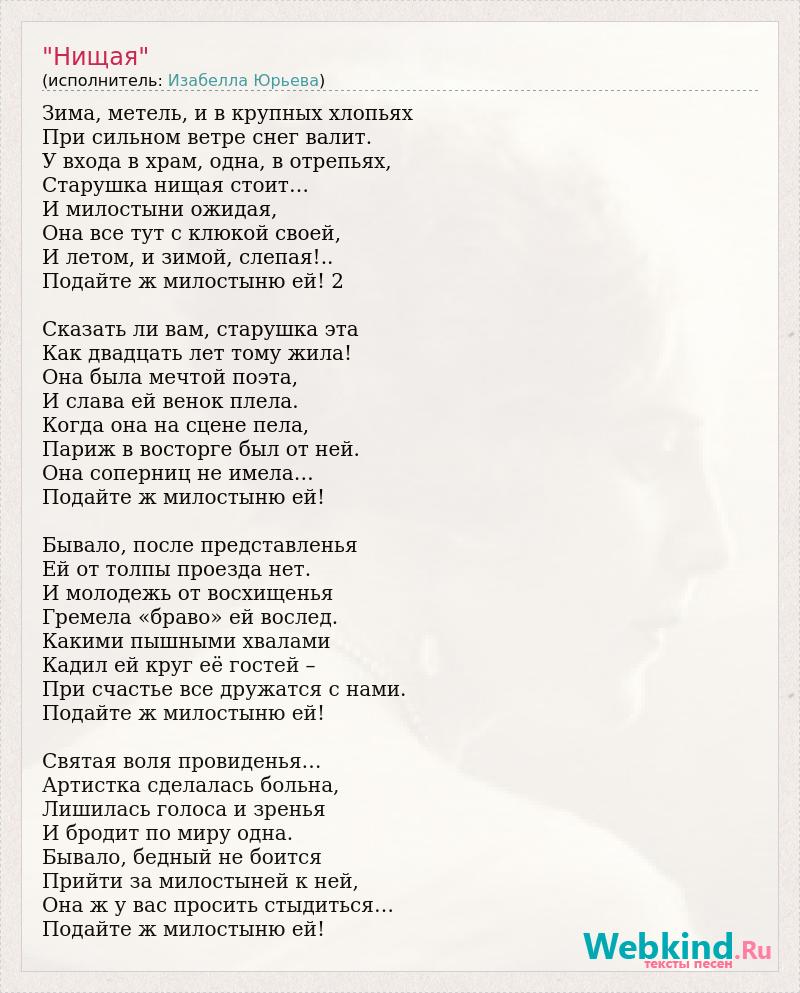 Зима, метель, и в крупных хлопьях При сильном ветре снег валит. У входа в храм, одна, в отрепьях, Старушка нищая стоит… И милостыни ожидая, Она все тут с клюкой своей, И летом, и зимой, слепая!.. Подайте ж милостыню ей! 2 Сказать ли вам, старушка эта Как двадцать лет тому жила! Она была мечтой поэта, И слава ей венок плела. Когда она на сцене пела, Париж в восторге был от ней. Она соперниц не имела… Подайте ж милостыню ей! Бывало, после представленья Ей от толпы проезда нет. И молодежь от восхищенья Гремела «браво» ей вослед. Какими пышными хвалами Кадил ей круг её гостей – При счастье все дружатся с нами. Подайте ж милостыню ей! Святая воля провиденья… Артистка сделалась больна, Лишилась голоса и зренья И бродит по миру одна. Бывало, бедный не боится Прийти за милостыней к ней, Она ж у вас просить стыдиться… Подайте ж милостыню ей!
