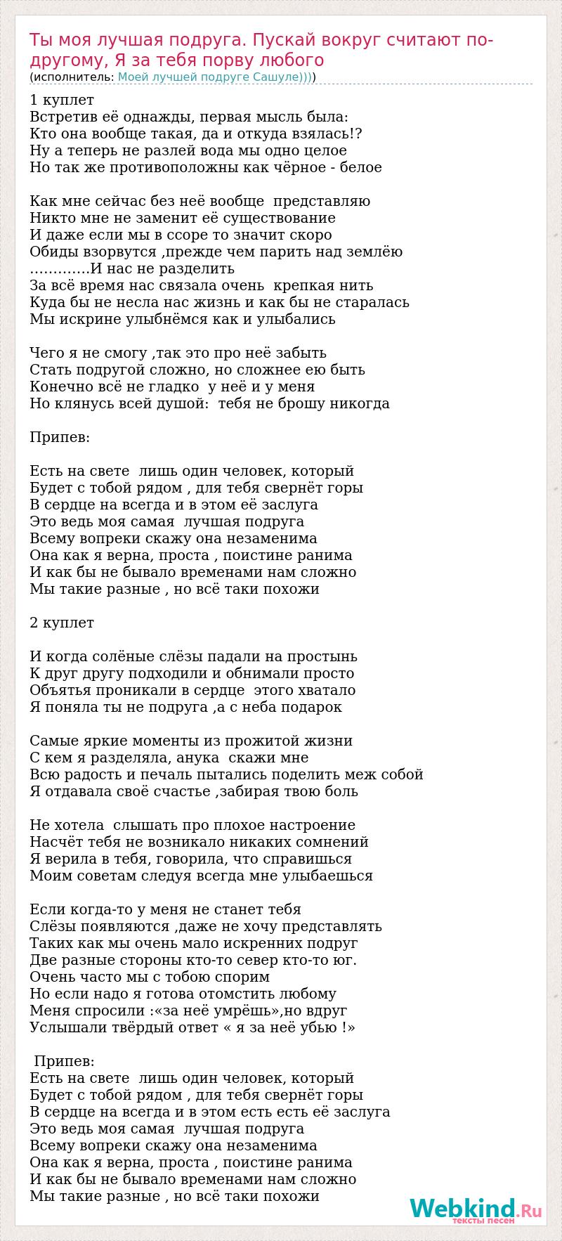 1 куплет Встретив её однажды, первая мысль была: Кто она вообще такая, да и откуда взялась!? Ну а теперь не разлей вода мы одно целое Но так же противоположны как чёрное - белое Как мне сейчас без неё вообще представляю Никто мне не заменит её существование И даже если мы в ссоре то значит скоро Обиды взорвутся ,прежде чем парить над землёю ………….И нас не разделить За всё время нас связала очень крепкая нить Куда бы не несла нас жизнь и как бы не старалась Мы искрине улыбнёмся как и улыбались Чего я не смогу ,так это про неё забыть Стать подругой сложно, но сложнее ею быть Конечно всё не гладко у неё и у меня Но клянусь всей душой: тебя не брошу никогда Припев: Есть на свете лишь один человек, который Будет с тобой рядом , для тебя свернёт горы В сердце на всегда и в этом её заслуга Это ведь моя самая лучшая подруга Всему вопреки скажу она незаменима Она как я верна, проста , поистине ранима И как бы не бывало временами нам сложно Мы такие разные , но всё таки похожи 2 куплет И когда солёные слёзы падали на простынь К друг другу подходили и обнимали просто Объятья проникали в сердце этого хватало Я поняла ты не подруга ,а с неба подарок Самые яркие моменты из прожитой жизни С кем я разделяла, анука скажи мне Всю радость и печаль пытались поделить меж собой Я отдавала своё счастье ,забирая твою боль Не хотела слышать про плохое настроение Насчёт тебя не возникало никаких сомнений Я верила в тебя, говорила, что справишься Моим советам следуя всегда мне улыбаешься Если когда-то у меня не станет тебя Слёзы появляются ,даже не хочу представлять Таких как мы очень мало искренних подруг Две разные стороны кто-то север кто-то юг. Очень часто мы с тобою спорим Но если надо я готова отомстить любому Меня спросили :«за неё умрёшь»,но вдруг Услышали твёрдый ответ « я за неё убью !» Припев: Есть на свете лишь один человек, который Будет с тобой рядом , для тебя свернёт горы В сердце на всегда и в этом есть есть её заслуга Это ведь моя самая лучшая подруга Всему вопреки скажу она незаменима Она как я верна, проста , поистине ранима И как бы не бывало временами нам сложно Мы такие разные , но всё таки похожи