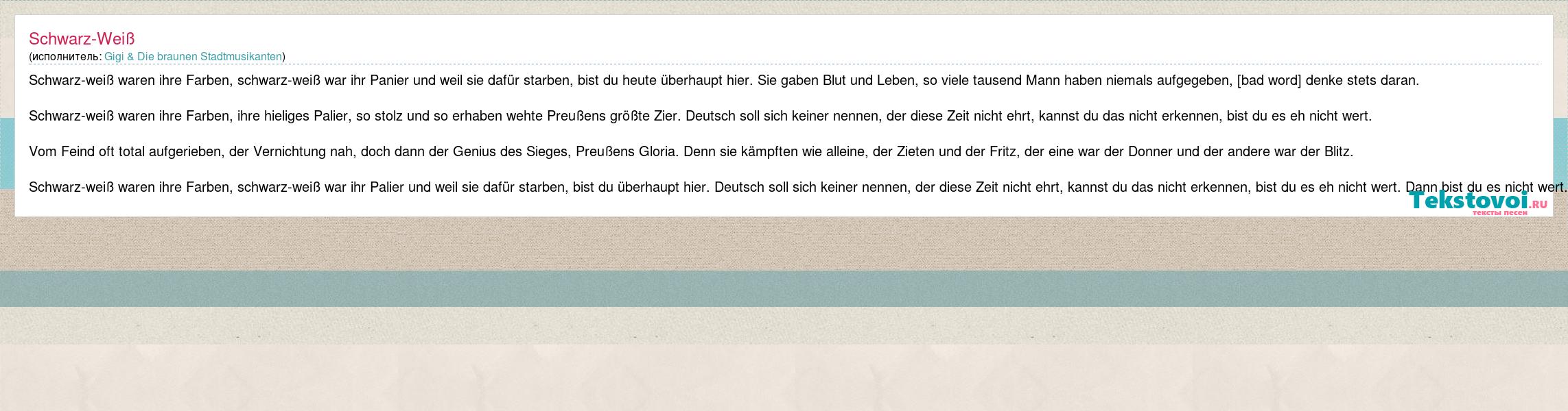 Schwarz-weiß waren ihre Farben, schwarz-weiß war ihr Panier und weil sie dafür starben, bist du heute überhaupt hier. Sie gaben Blut und Leben, so viele tausend Mann haben niemals aufgegeben, drum denke stets daran. Schwarz-weiß waren ihre Farben, ihre hieliges Palier, so stolz und so erhaben wehte Preußens größte Zier. Deutsch soll sich keiner nennen, der diese Zeit nicht ehrt, kannst du das nicht erkennen, bist du es eh nicht wert. Vom Feind oft total aufgerieben, der Vernichtung nah, doch dann der Genius des Sieges, Preußens Gloria. Denn sie kämpften wie alleine, der Zieten und der Fritz, der eine war der Donner und der andere war der Blitz. Schwarz-weiß waren ihre Farben, schwarz-weiß war ihr Palier und weil sie dafür starben, bist du überhaupt hier. Deutsch soll sich keiner nennen, der diese Zeit nicht ehrt, kannst du das nicht erkennen, bist du es eh nicht wert. Dann bist du es nicht wert.
