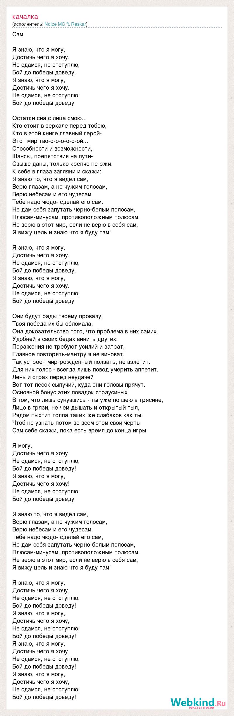 Сам Я знаю, что я могу, Достичь чего я хочу. Не сдамся, не отступлю, Бой до победы доведу. Я знаю, что я могу, Достичь чего я хочу. Не сдамся, не отступлю, Бой до победы доведу Остатки сна с лица смою... Кто стоит в зеркале перед тобою, Кто в этой книге главный герой- Этот мир тво-о-о-о-о-о-ой... Способности и возможности, Шансы, препятствия на пути- Свыше даны, только крепче не ржи. К себе в глаза загляни и скажи: Я знаю то, что я видел сам, Верю глазам, а не чужим голосам, Верю небесам и его чудесам. Тебе надо чюдо- сделай его сам. Не дам себя запутать черно-белым полосам, Плюсам-минусам, противоположным полюсам, Не верю в этот мир, если не верю в себя сам, Я вижу цель и знаю что я буду там! Я знаю, что я могу, Достичь чего я хочу. Не сдамся, не отступлю, Бой до победы доведу. Я знаю, что я могу, Достичь чего я хочу. Не сдамся, не отступлю, Бой до победы доведу Они будут рады твоему провалу, Твоя победа их бы обломала, Она докозательство того, что проблема в них самих. Удобней в своих бедах винить других, Поражения не требуют усилий и затрат, Главное повторять-мантру я не виноват, Так устроен мир-рожденный ползать, не взлетит. Для них голос - всегда лишь повод умерить аппетит, Лень и страх перед неудачей Вот тот песок сыпучий, куда они головы прячут. Основной бонус этих повадок страусиных В том, что лишь сунувшись - ты уже по шею в трясине, Лицо в грязи, не чем дышать и открытый тыл, Рядом пыхтит толпа таких же слабаков как ты. Чтоб не узнать потом во всем этом свои черты Сам себе скажи, пока есть время до конца игры Я могу, Достичь чего я хочу, Не сдамся, не отступлю, Бой до победы доведу! Я знаю, что я могу, Достичь чего я хочу! Не сдамся, не отступлю, Бой до победы доведу Я знаю то, что я видел сам, Верю глазам, а не чужим голосам, Верю небесам и его чудесам. Тебе надо чюдо- сделай его сам, Не дам себя запутать черно-белым полосам, Плюсам-минусам, противоположным полюсам, Не верю в этот мир, если не верю в себя сам, Я вижу цель и знаю что я буду там! Я знаю, что я могу, Достичь чего я хочу, Не сдамся, не отступлю, Бой до победы доведу! Я знаю, что я могу, Достичь чего я хочу, Не сдамся, не отступлю, Бой до победы доведу! Я знаю, что я могу, Достичь чего я хочу, Не сдамся, не отступлю, Бой до победы доведу! Я знаю, что я могу, Достичь чего я хочу, Не сдамся, не отступлю, Бой до победы доведу!