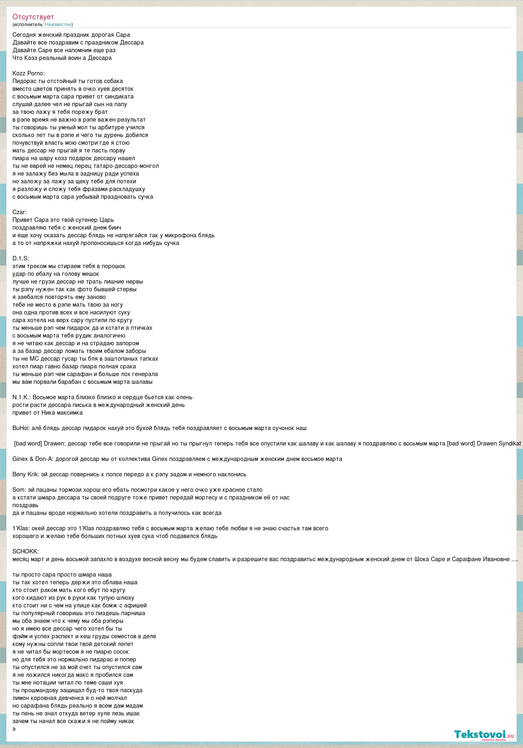 Сегодня женский праздник дорогая Сара Давайте все поздравим с праздником Дессара Давайте Саре все напомним еще раз Что Козз реальный воин а Дессара Kozz Porno: Пидорас ты отстойный ты готов собака вместо цветов принять в очко хуев десяток с восьмым марта сара привет от синдиката слушай далее чел не прыгай сын на папу за твою лажу я тебя порежу брат в рэпе время не важно в рэпе важен результат ты говоришь ты умный мол ты арбитуре учился сколько лет ты в рэпе и чего ты дурень добился почувствуй власть мою смотри где я стою мать дессар не прыгай я те пасть порву пиара на шару козз подарок дессару нашел ты не еврей не немец перец татаро-дессаро-монгол я не залажу без мыла в задницу ради успеха но заложу за лажу за щеку тебе для потехи я разложу и сложу тебя фразами раскладушку с восьмым марта сара уебывай праздновать сучка Czar: Привет Сара это твой сутенер Царь поздравляю тебя с женский днем биич и еще хочу сказать дессар блядь не напрягайся так у микрофона блядь а то от напряжки нахуй пропоносишься когда нибудь сучка D.1.S: этим треком мы стираем тебя в порошок удар по ебалу на голову мешок лучше не грузи дессар не трать лишние нервы ты рэпу нужен так как фото бывшей стервы я заебался повторять ему заново тебе не место в рэпе мать твою за ногу она одна против всех и все насилуют суку сара хотела на верх сару пустили по кругу ты меньше рэп чем пидарок да и кстати а птичках с восьмым марта тебя рудик аналогично я не читаю как дессар и на страдаю запором а за базар дессар ломать твоим ебалом заборы ты не МС дессар гусар ты бля в заштопаных тапках хотел пиар гавно базар пиара полная срака ты меньше рэп чем сарафан и больше лох генерала мы вам порвали барабан с восьмым марта шалавы N.1.K.: Восьмое марта близко близко и сердце бьется как олень рости расти дессара писька в международный женский день привет от Ника максимка BuHoi: алё блядь дессар пидарок нахуй это бухой блядь тебя поздравляет с восьмым марта сучонок наш Damn Drawen: дессар тебе все говорили не прыгай но ты прыгнул теперь тебя все опустили как шалаву и как шалаву я поздравляю с восьмым марта Damn Drawen Syndikat Ginex & Don-A: дорогой дессар мы от коллектива Ginex поздравляем с международным женским днем восьмое марта Beny Krik: эй дессар повернись к попсе передо а к рэпу задом и немного наклонись Som: эй пацаны тормози хорош его ебать посмотри какое у него очко уже красное стало а кстати шмара дессара ты своей подруге тоже привет передай мортесу и с праздником её от нас поздравь да и пацаны вроде нормально хотели поздравить а получилось как всегда 1’Klas: окей дессар это 1’Klas поздравляю тебя с восьмым марта желаю тебе любви я не знаю счастья там всего хорошего и желаю тебе больших потных хуев сука чтоб подавился блядь SCHOKK: месяц март и день восьмой запахло в воздухе весной весну мы будем славить и разрешите вас поздравитьс международным женский днем от Шока Саре и Сарафане Ивановне .... ты просто сара просто шмара наша ты так хотел теперь держи это облава наша кто стоит раком мать кого ебут по кругу кого кидают из рук в руки как тупую шлюху кто стоит ни с чем на улице как бомж с афишей ты популярный говоришь это пиздешь парниша мы оба знаем что к чему мы оба рэперы но я имею все дессар чего хотел бы ты фэйм и успех рэспект и кеш груды семестов в деле кому нужны сопли твои твой детский лепет я не читал бы мортесом я не пиарю сосок но д