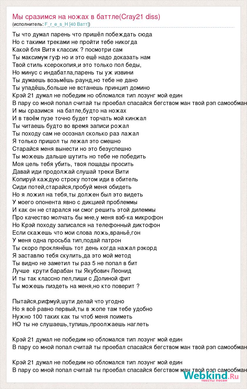 Ты что думал парень что пришёл побеждать сюда Но с такими треками не пройти тебе никогда Какой бля Витя классик ? посмотри сам Ты максимум гуф но и это ещё надо доказать нам Твой стиль ксерокопия,и это только пол беды, Но минус с индабатла,парень ты уж извини Ты думаешь возьмёшь раунд,но тебе не дано Ты упадёшь,больше не встанешь принцип домино Крэй 21 думал не победим но обломался тип лозунг мой един В пару со мной попал считай ты проебал спасайся бегством ман твой рэп самообман И мы сразимся на батле,будто на ножах И в твоём пузе точно будет торчать мой кинжал Ты читаешь будто во время записи рожал Ты походу сам не осознал сколько раз лажал Я только пришол ты лежал это смешно Старайся меня вынести но это безуспешно Ты можешь дальше шутить но тебе не победить Моя цель тебя убить, твоя пощады просить Давай иди продолжай слушай треки Вити Копируй каждую строку потом иди в обитель Сиди потей,старайся,пробуй меня обидеть Но я ложил на тебя,ты должен был это видеть У моего опонента явно с дикцией проблеммы И как он не старался ни смог решить этой дилеммы Про качество молчать бы мне,у меня вэб-ка микрофон Но Крэй походу записался на телефонный диктофон Если скажешь что мои слова ложь,враньё,гон У меня одна просьба тип,подай патрон Ты скоро проклянёшь тот день когда нажал рэкорд Я заставлю тебя скулить,да это мой метод Ты видно не заметил ты раз 5 не попал в бит Лучше крути барабан ты Якубович Леонид И ты так классно пел,пиши с Долиной фит Ты можешь пиздеть на меня,но кто поверит ? Пытайся,рифмуй,шути делай что угодно Но я всё равно первый,ты в жопе там тебе удобно Нужно 100 таких как ты чтоб меня поиметь НО ты не слушаешь,тупишь,проолжаешь наглеть Крэй 21 думал не победим но обломался тип лозунг мой един В пару со мной попал считай ты проебал спасайся бегством ман твой рэп самообман Крэй 21 думал не победим но обломался тип лозунг мой един В пару со мной попал считай ты проебал спасайся бегством ман твой рэп самообман