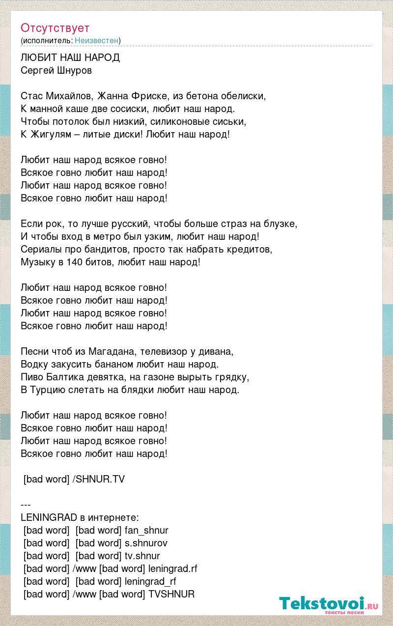 ЛЮБИТ НАШ НАРОД Сергей Шнуров Стас Михайлов, Жанна Фриске, из бетона обелиски, К манной каше две сосиски, любит наш народ. Чтобы потолок был низкий, силиконовые сиськи, К Жигулям – литые диски! Любит наш народ! Любит наш народ всякое говно! Всякое говно любит наш народ! Любит наш народ всякое говно! Всякое говно любит наш народ! Если рок, то лучше русский, чтобы больше страз на блузке, И чтобы вход в метро был узким, любит наш народ! Сериалы про бандитов, просто так набрать кредитов, Музыку в 140 битов, любит наш народ! Любит наш народ всякое говно! Всякое говно любит наш народ! Любит наш народ всякое говно! Всякое говно любит наш народ! Песни чтоб из Магадана, телевизор у дивана, Водку закусить бананом любит наш народ. Пиво Балтика девятка, на газоне вырыть грядку, В Турцию слетать на блядки любит наш народ. Любит наш народ всякое говно! Всякое говно любит наш народ! Любит наш народ всякое говно! Всякое говно любит наш народ! [bad word] /SHNUR.TV --- LENINGRAD в интернете: [bad word] [bad word] fan_shnur [bad word] [bad word] s.shnurov [bad word] [bad word] tv.shnur [bad word] /www [bad word] leningrad.rf [bad word] [bad word] leningrad_rf [bad word] /www [bad word] TVSHNUR