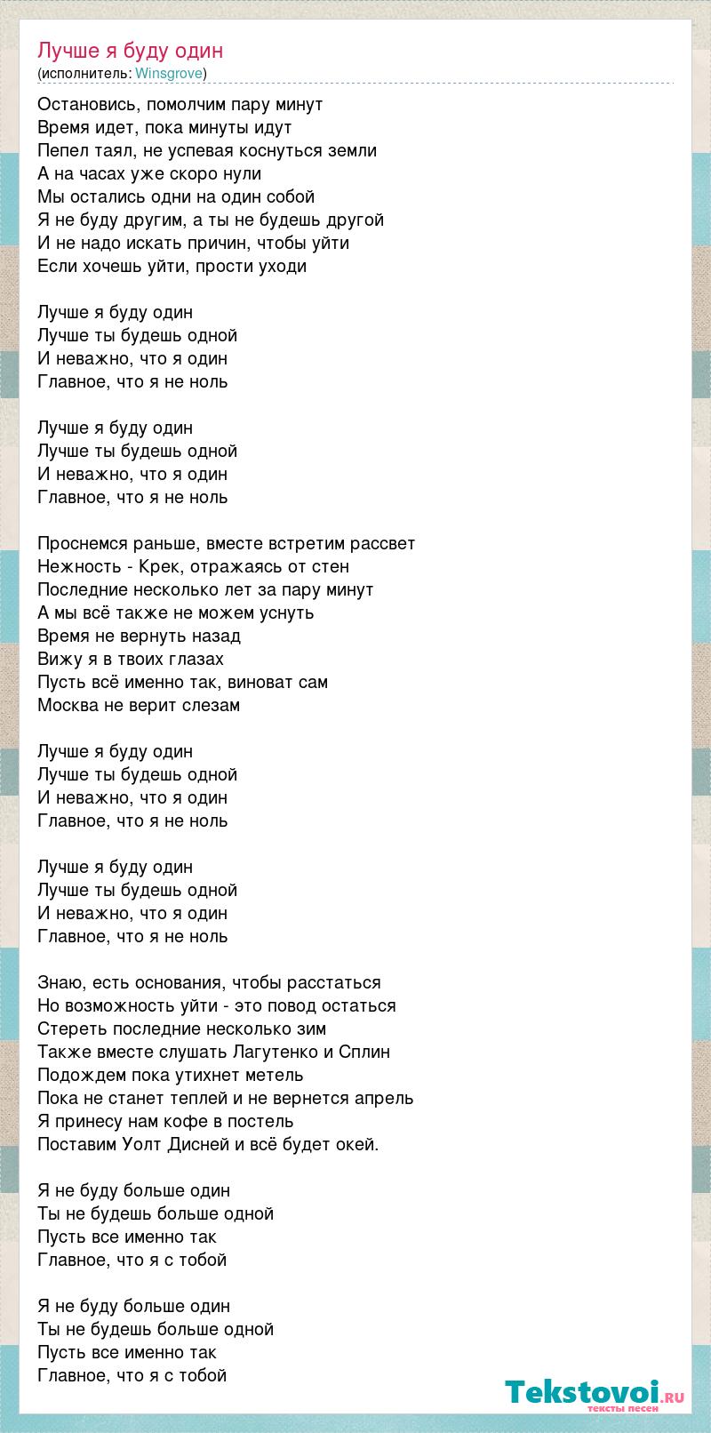 Остановись, помолчим пару минут Время идет, пока минуты идут Пепел таял, не успевая коснуться земли А на часах уже скоро нули Мы остались одни на один собой Я не буду другим, а ты не будешь другой И не надо искать причин, чтобы уйти Если хочешь уйти, прости уходи Лучше я буду один Лучше ты будешь одной И неважно, что я один Главное, что я не ноль Лучше я буду один Лучше ты будешь одной И неважно, что я один Главное, что я не ноль Проснемся раньше, вместе встретим рассвет Нежность - Крек, отражаясь от стен Последние несколько лет за пару минут А мы всё также не можем уснуть Время не вернуть назад Вижу я в твоих глазах Пусть всё именно так, виноват сам Москва не верит слезам Лучше я буду один Лучше ты будешь одной И неважно, что я один Главное, что я не ноль Лучше я буду один Лучше ты будешь одной И неважно, что я один Главное, что я не ноль Знаю, есть основания, чтобы расстаться Но возможность уйти - это повод остаться Стереть последние несколько зим Также вместе слушать Лагутенко и Сплин Подождем пока утихнет метель Пока не станет теплей и не вернется апрель Я принесу нам кофе в постель Поставим Уолт Дисней и всё будет окей. Я не буду больше один Ты не будешь больше одной Пусть все именно так Главное, что я с тобой Я не буду больше один Ты не будешь больше одной Пусть все именно так Главное, что я с тобой
