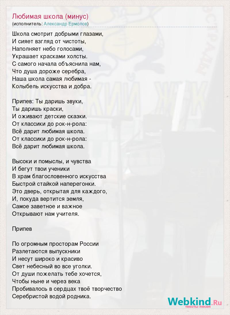 Школа смотрит добрыми глазами, И сияет взгляд от чистоты, Наполняет небо голосами, Украшает красками холсты. С самого начала объяснила нам, Что душа дороже серебра, Наша школа самая любимая - Колыбель искусства и добра. Припев: Ты даришь звуки, Ты даришь краски, И оживают детские сказки. От классики до рок-н-рола: Всё дарит любимая школа. От классики до рок-н-рола: Всё дарит любимая школа. Высоки и помыслы, и чувства И бегут твои ученики В храм благословенного искусства Быстрой стайкой наперегонки. Это дверь, открытая для каждого, И, покуда вертится земля, Самое заветное и важное Открывают нам учителя. Припев По огромным просторам России Разлетаются выпускники И несут широко и красиво Свет небесный во все уголки. От души пожелать тебе хочется, Чтобы ныне и через века Пробивалось в сердцах твоё творчество Серебристой водой родника.