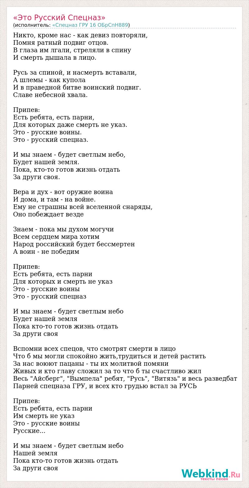 Никто, кроме нас - как девиз повторяли, Помня ратный подвиг отцов. В глаза им лгали, стреляли в спину И смерть дышала в лицо. Русь за спиной, и насмерть вставали, А шлемы - как купола И в праведной битве воинский подвиг. Славе небесной хвала. Припев: Есть ребята, есть парни, Для которых даже смерть не указ. Это - русские воины. Это - русский спецназ. И мы знаем - будет светлым небо, Будет нашей земля. Пока, кто-то готов жизнь отдать За други своя. Вера и дух - вот оружие воина И дома, и там - на войне. Ему не страшны всей вселенной снаряды, Оно побеждает везде Знаем - пока мы духом могучи Всем сердцем мира хотим Народ российский будет бессмертен А воин - не победим Припев: Есть ребята, есть парни Для которых и смерть не указ Это - русские воины Это - русский спецназ И мы знаем - будет светлым небо Будет нашей земля Пока кто-то готов жизнь отдать За други своя Вспомни всех спецов, что смотрят смерти в лицо Что б мы могли спокойно жить,трудиться и детей растить За нас воюют пацаны - ты их молитвой помяни Живых и кто главу сложил за то что б ты счастливо жил Весь "Айсберг", "Вымпела" ребят, "Русь", "Витязь" и весь разведбат Парней спецназа ГРУ, и всех кто грудью встал за РУСЬ Припев: Есть ребята, есть парни Им смерть не указ Это - русские воины Русские... И мы знаем - будет светлым небо Нашей земля Пока кто-то готов жизнь отдать За други своя