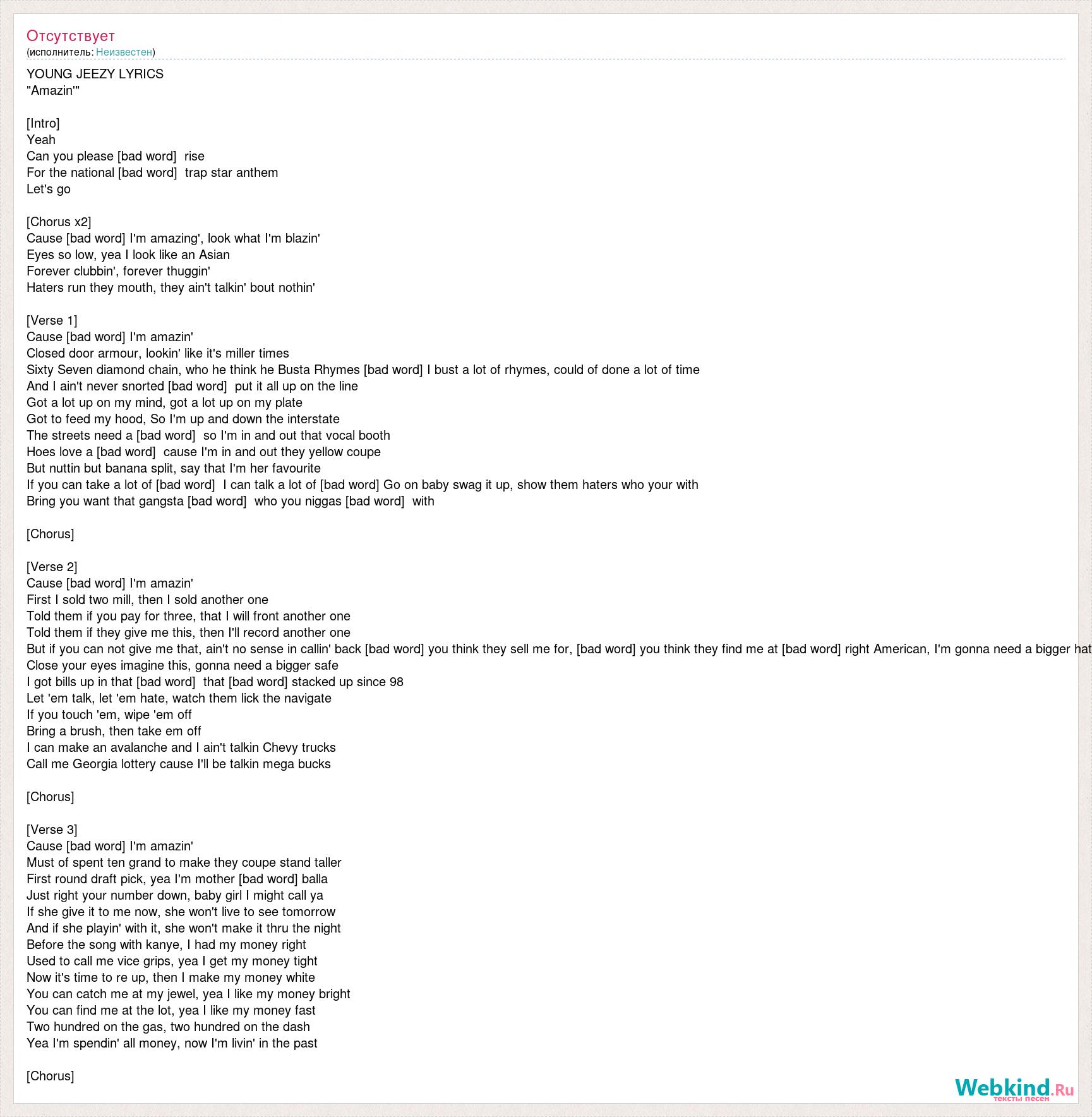 YOUNG JEEZY LYRICS "Amazin'" [Intro] Yeah Can you please [bad word] rise For the national [bad word] trap star anthem Let's go [Chorus x2] Cause [bad word] I'm amazing', look what I'm blazin' Eyes so low, yea I look like an Asian Forever clubbin', forever thuggin' Haters run they mouth, they ain't talkin' bout nothin' [Verse 1] Cause [bad word] I'm amazin' Closed door armour, lookin' like it's miller times Sixty Seven diamond chain, who he think he Busta Rhymes [bad word] I bust a lot of rhymes, could of done a lot of time And I ain't never snorted [bad word] put it all up on the line Got a lot up on my mind, got a lot up on my plate Got to feed my hood, So I'm up and down the interstate The streets need a [bad word] so I'm in and out that vocal booth Hoes love a [bad word] cause I'm in and out they yellow coupe But nuttin but banana split, say that I'm her favourite If you can take a lot of [bad word] I can talk a lot of [bad word] Go on baby swag it up, show them haters who your with Bring you want that gangsta [bad word] who you niggas [bad word] with [Chorus] [Verse 2] Cause [bad word] I'm amazin' First I sold two mill, then I sold another one Told them if you pay for three, that I will front another one Told them if they give me this, then I'll record another one But if you can not give me that, ain't no sense in callin' back [bad word] you think they sell me for, [bad word] you think they find me at [bad word] right American, I'm gonna need a bigger hat Close your eyes imagine this, gonna need a bigger safe I got bills up in that [bad word] that [bad word] stacked up since 98 Let 'em talk, let 'em hate, watch them lick the navigate If you touch 'em, wipe 'em off Bring a brush, then take em off I can make an avalanche and I ain't talkin Chevy trucks Call me Georgia lottery cause I'll be talkin mega bucks [Chorus] [Verse 3] Cause [bad word] I'm amazin' Must of spent ten grand to make they coupe stand taller First round draft pick, yea I'm mother [bad word] balla Just right your number down, baby girl I might call ya If she give it to me now, she won't live to see tomorrow And if she playin' with it, she won't make it thru the night Before the song with kanye, I had my money right Used to call me vice grips, yea I get my money tight Now it's time to re up, then I make my money white You can catch me at my jewel, yea I like my money bright You can find me at the lot, yea I like my money fast Two hundred on the gas, two hundred on the dash Yea I'm spendin' all money, now I'm livin' in the past [Chorus]