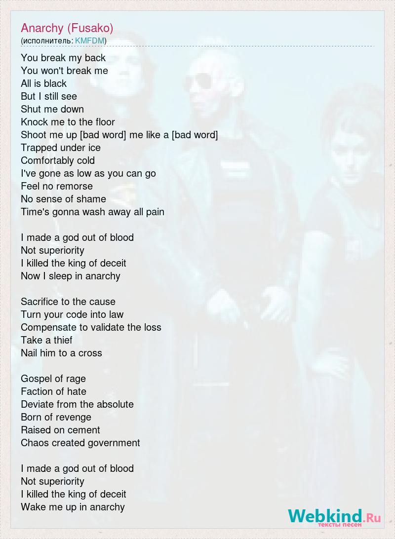 You break my back You won't break me All is black But I still see Shut me down Knock me to the floor Shoot me up [bad word] me like a [bad word] Trapped under ice Comfortably cold I've gone as low as you can go Feel no remorse No sense of shame Time's gonna wash away all pain I made a god out of blood Not superiority I killed the king of deceit Now I sleep in anarchy Sacrifice to the cause Turn your code into law Compensate to validate the loss Take a thief Nail him to a cross Gospel of rage Faction of hate Deviate from the absolute Born of revenge Raised on cement Chaos created government I made a god out of blood Not superiority I killed the king of deceit Wake me up in anarchy