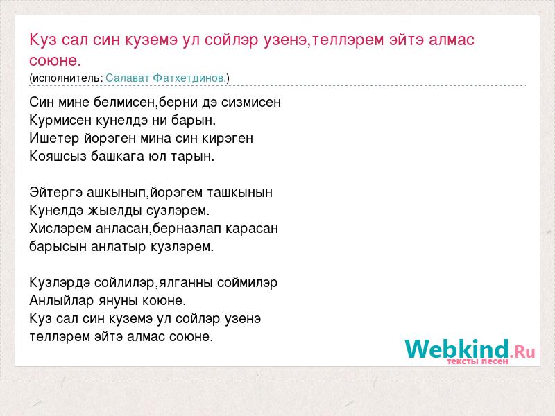 Син мине белмисен,берни дэ сизмисен Курмисен кунелдэ ни барын. Ишетер йорэген мина син кирэген Кояшсыз башкага юл тарын. Эйтергэ ашкынып,йорэгем ташкынын Кунелдэ жыелды сузлэрем. Хислэрем анласан,берназлап карасан барысын анлатыр кузлэрем. Кузлэрдэ сойлилэр,ялганны соймилэр Анлыйлар януны коюне. Куз сал син куземэ ул сойлэр узенэ теллэрем эйтэ алмас союне.
