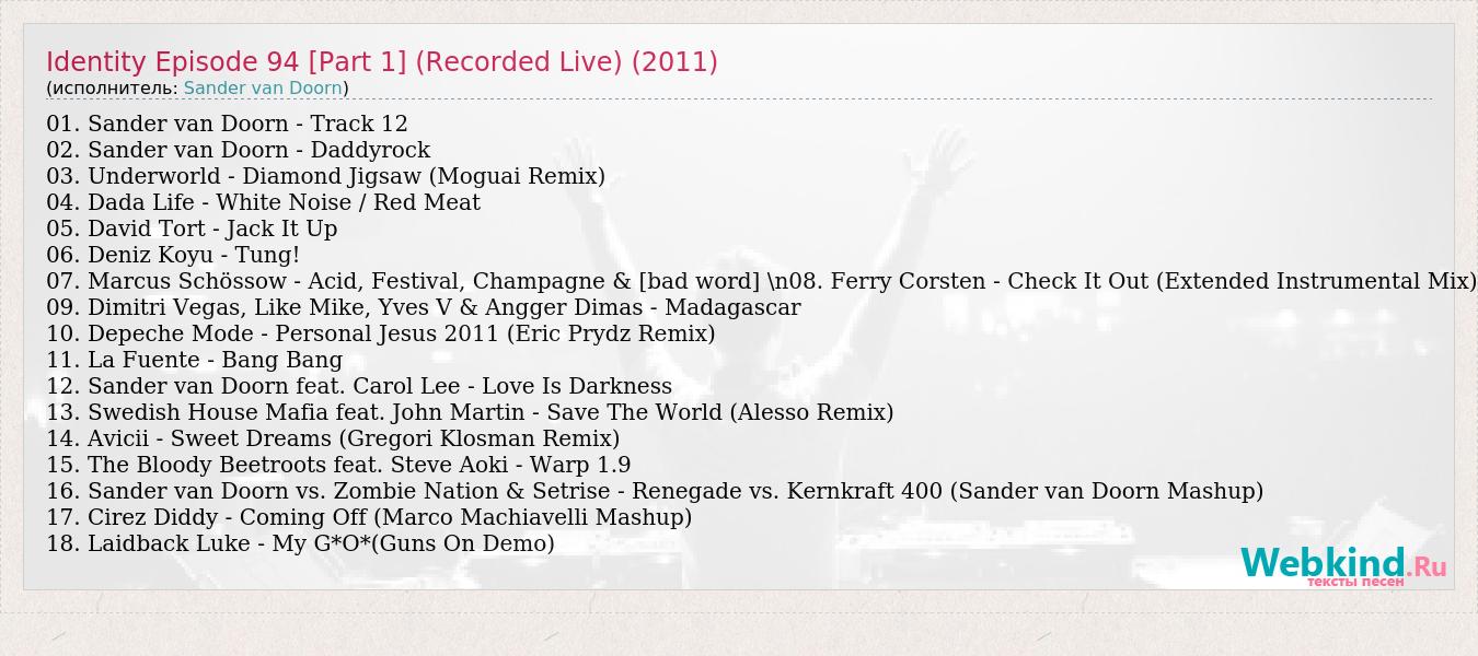 01. Sander van Doorn - Track 12 02. Sander van Doorn - Daddyrock 03. Underworld - Diamond Jigsaw (Moguai Remix) 04. Dada Life - White Noise / Red Meat 05. David Tort - Jack It Up 06. Deniz Koyu - Tung! 07. Marcus Schössow - Acid, Festival, Champagne & [bad word] \n08. Ferry Corsten - Check It Out (Extended Instrumental Mix) 09. Dimitri Vegas, Like Mike, Yves V & Angger Dimas - Madagascar 10. Depeche Mode - Personal Jesus 2011 (Eric Prydz Remix) 11. La Fuente - Bang Bang 12. Sander van Doorn feat. Carol Lee - Love Is Darkness 13. Swedish House Mafia feat. John Martin - Save The World (Alesso Remix) 14. Avicii - Sweet Dreams (Gregori Klosman Remix) 15. The Bloody Beetroots feat. Steve Aoki - Warp 1.9 16. Sander van Doorn vs. Zombie Nation & Setrise - Renegade vs. Kernkraft 400 (Sander van Doorn Mashup) 17. Cirez Diddy - Coming Off (Marco Machiavelli Mashup) 18. Laidback Luke - My G*O*(Guns On Demo)