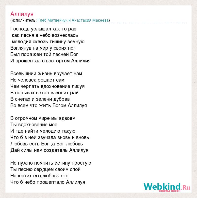 Господь услышал как то раз как песня в небо вознеслась ,мелодия сквозь тишину земную Взглянув на мир у своих ног Был поражен той песней Бог И прошептал с восторгом Аллилия Всевышний,жизнь вручает нам Но человек решает сам Чем черпать вдохновение ликуя В порывах ветра взвонит рай В снегах и зелени дубрав Во всем что жить Богом Аллилуя В огромном мире мы вдвоем Ты вдохновение мое И где найти мелодию такую Что б в ней звучала вновь и вновь Любовь есть Бог ,а Бог любовь Дай силы нам создатель Аллилуя Но нужно помнить истину простую Ты песню сердцем своим спой Навестит его,любовь его Что б небо прошептало Аллилуя