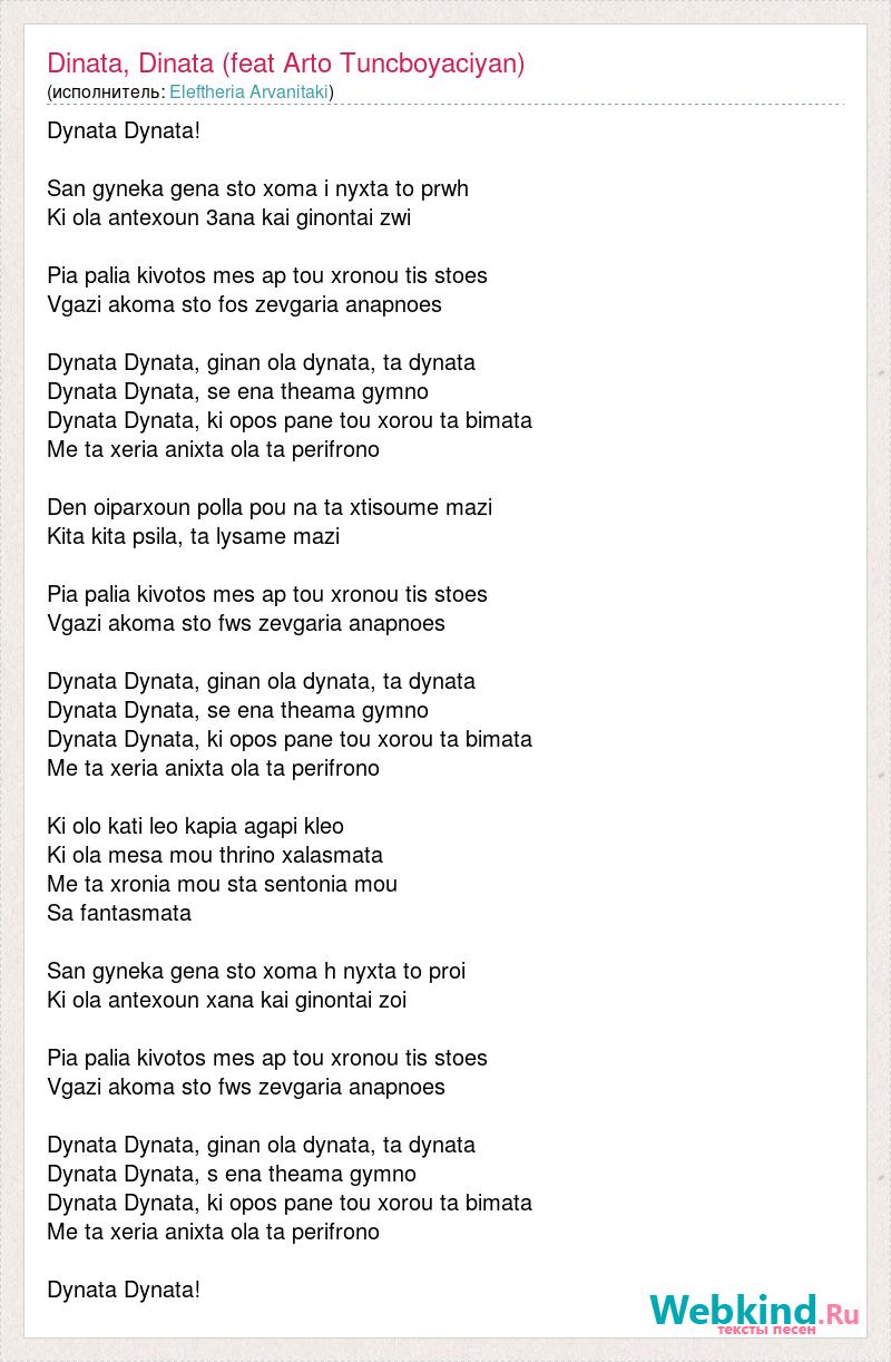 Dynata Dynata! San gyneka gena sto xoma i nyxta to prwh Ki ola antexoun 3ana kai ginontai zwi Pia palia kivotos mes ap tou xronou tis stoes Vgazi akoma sto fos zevgaria anapnoes Dynata Dynata, ginan ola dynata, ta dynata Dynata Dynata, se ena theama gymno Dynata Dynata, ki opos pane tou xorou ta bimata Me ta xeria anixta ola ta perifrono Den oiparxoun polla pou na ta xtisoume mazi Kita kita psila, ta lysame mazi Pia palia kivotos mes ap tou xronou tis stoes Vgazi akoma sto fws zevgaria anapnoes Dynata Dynata, ginan ola dynata, ta dynata Dynata Dynata, se ena theama gymno Dynata Dynata, ki opos pane tou xorou ta bimata Me ta xeria anixta ola ta perifrono Ki olo kati leo kapia agapi kleo Ki ola mesa mou thrino xalasmata Me ta xronia mou sta sentonia mou Sa fantasmata San gyneka gena sto xoma h nyxta to proi Ki ola antexoun xana kai ginontai zoi Pia palia kivotos mes ap tou xronou tis stoes Vgazi akoma sto fws zevgaria anapnoes Dynata Dynata, ginan ola dynata, ta dynata Dynata Dynata, s ena theama gymno Dynata Dynata, ki opos pane tou xorou ta bimata Me ta xeria anixta ola ta perifrono Dynata Dynata!