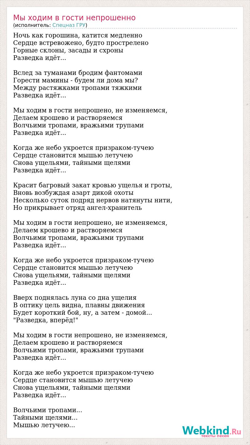 Ночь как горошина, катится медленно Сердце встревожено, будто прострелено Горные склоны, засады и схроны Разведка идёт... Вслед за туманами бродим фантомами Горести мамины - будем ли дома мы? Между растяжками тропами тяжкими Разведка идёт... Мы ходим в гости непрошено, не изменяемся, Делаем крошево и растворяемся Волчьими тропами, вражьими трупами Разведка идёт... Когда же небо укроется призраком-тучею Сердце становится мышью летучею Снова ущельями, тайными щелями Разведка идёт... Красит багровый закат кровью ущелья и гроты, Вновь возбуждая азарт дикой охоты Несколько суток подряд нервов натянуты нити, Но прикрывает отряд ангел-хранитель Мы ходим в гости непрошено, не изменяемся, Делаем крошево и растворяемся Волчьими тропами, вражьими трупами Разведка идёт... Когда же небо укроется призраком-тучею Сердце становится мышью летучею Снова ущельями, тайными щелями Разведка идёт... Вверх поднялась луна со дна ущелия В оптику цель видна, плавны движения Будет короткий бой, ну, а затем - домой... "Разведка, вперёд!" Мы ходим в гости непрошено, не изменяемся, Делаем крошево и растворяемся Волчьими тропами, вражьими трупами Разведка идёт... Когда же небо укроется призраком-тучею Сердце становится мышью летучею Снова ущельями, тайными щелями Разведка идёт... Волчьими тропами... Тайными щелями... Мышью летучею...