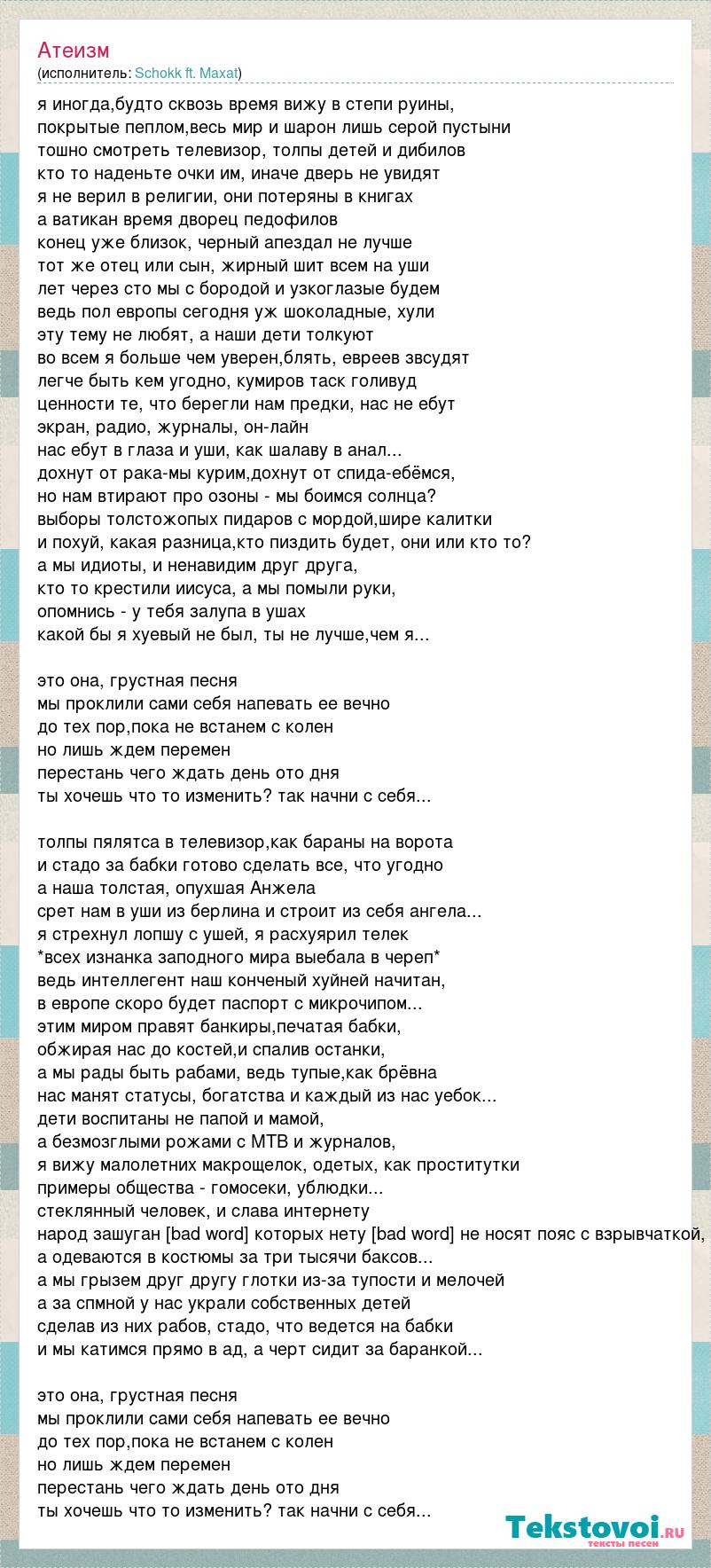 я иногда,будто сквозь время вижу в степи руины, покрытые пеплом,весь мир и шарон лишь серой пустыни тошно смотреть телевизор, толпы детей и дибилов кто то наденьте очки им, иначе дверь не увидят я не верил в религии, они потеряны в книгах а ватикан время дворец педофилов конец уже близок, черный апездал не лучше тот же отец или сын, жирный шит всем на уши лет через сто мы с бородой и узкоглазые будем ведь пол европы сегодня уж шоколадные, хули эту тему не любят, а наши дети толкуют во всем я больше чем уверен,блять, евреев звсудят легче быть кем угодно, кумиров таск голивуд ценности те, что берегли нам предки, нас не ебут экран, радио, журналы, он-лайн нас ебут в глаза и уши, как шалаву в анал... дохнут от рака-мы курим,дохнут от спида-ебёмся, но нам втирают про озоны - мы боимся солнца? выборы толстожопых пидаров с мордой,шире калитки и похуй, какая разница,кто пиздить будет, они или кто то? а мы идиоты, и ненавидим друг друга, кто то крестили иисуса, а мы помыли руки, опомнись - у тебя залупа в ушах какой бы я хуевый не был, ты не лучше,чем я... это она, грустная песня мы проклили сами себя напевать ее вечно до тех пор,пока не встанем с колен но лишь ждем перемен перестань чего ждать день ото дня ты хочешь что то изменить? так начни с себя... толпы пялятса в телевизор,как бараны на ворота и стадо за бабки готово сделать все, что угодно а наша толстая, опухшая Анжела срет нам в уши из берлина и строит из себя ангела... я стрехнул лопшу с ушей, я расхуярил телек *всех изнанка заподного мира выебала в череп* ведь интеллегент наш конченый хуйней начитан, в европе скоро будет паспорт с микрочипом... этим миром правят банкиры,печатая бабки, обжирая нас до костей,и спалив останки, а мы рады быть рабами, ведь тупые,как брёвна нас манят статусы, богатства и каждый из нас уебок... дети воспитаны не папой и мамой, а безмозглыми рожами с МТВ и журналов, я вижу малолетних макрощелок, одетых, как проститутки примеры общества - гомосеки, ублюдки... стеклянный человек, и слава интернету народ зашуган [bad word] которых нету [bad word] не носят пояс с взрывчаткой, а одеваются в костюмы за три тысячи баксов... а мы грызем друг другу глотки из-за тупости и мелочей а за спмной у нас украли собственных детей сделав из них рабов, стадо, что ведется на бабки и мы катимся прямо в ад, а черт сидит за баранкой... это она, грустная песня мы проклили сами себя напевать ее вечно до тех пор,пока не встанем с колен но лишь ждем перемен перестань чего ждать день ото дня ты хочешь что то изменить? так начни с себя...