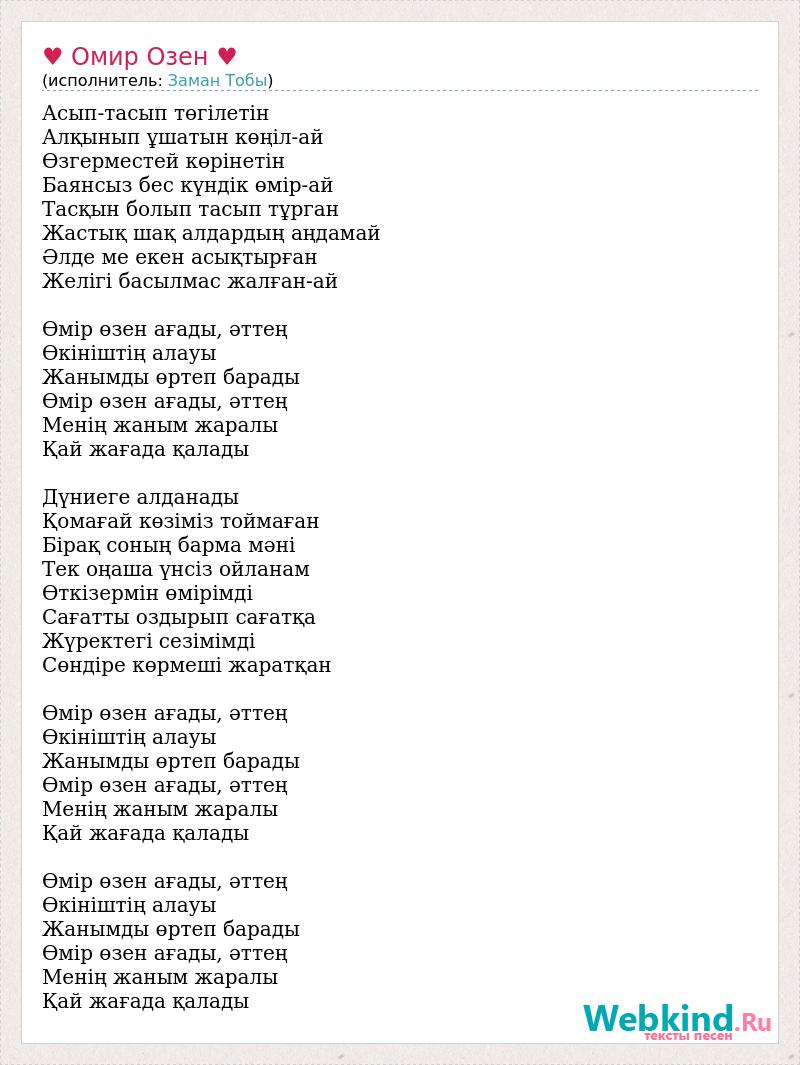 Асып-тасып төгілетін Алқынып ұшатын көңіл-ай Өзгерместей көрінетін Баянсыз бес күндік өмір-ай Тасқын болып тасып тұрган Жастық шақ алдардың аңдамай Әлде ме екен асықтырған Желігі басылмас жалған-ай Өмір өзен ағады, әттең Өкініштің алауы Жанымды өртеп барады Өмір өзен ағады, әттең Менің жаным жаралы Қай жағада қалады Дүниеге алданады Қомағай көзіміз тоймаған Бірақ соның барма мәні Тек оңаша үнсіз ойланам Өткізермін өмірімді Сағатты оздырып сағатқа Жүректегі сезімімді Сөндіре көрмеші жаратқан Өмір өзен ағады, әттең Өкініштің алауы Жанымды өртеп барады Өмір өзен ағады, әттең Менің жаным жаралы Қай жағада қалады Өмір өзен ағады, әттең Өкініштің алауы Жанымды өртеп барады Өмір өзен ағады, әттең Менің жаным жаралы Қай жағада қалады