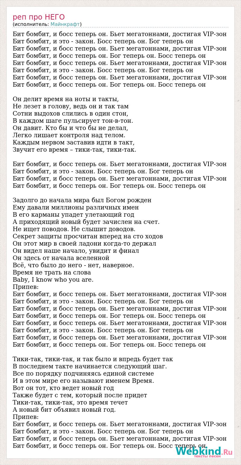 Бит бомбит, и босс теперь он. Бьет мегатоннами, достигая VIP-зон Бит бомбит, и это - закон. Босс теперь он. Бог теперь он Бит бомбит, и босс теперь он. Бьет мегатоннами, достигая VIP-зон Бит бомбит, и босс теперь он. Бог теперь он. Босс теперь он Бит бомбит, и босс теперь он. Бьет мегатоннами, достигая VIP-зон Бит бомбит, и это - закон. Босс теперь он. Бог теперь он Бит бомбит, и босс теперь он. Бьет мегатоннами, достигая VIP-зон Бит бомбит, и босс теперь он. Бог теперь он. Босс теперь он Он делит время на ноты и такты, Не лезет в голову, ведь он и так там Сотни выдохов слились в один стон, В каждом шаге пульсирует тон-в-тон. Он давит. Кто бы и что бы не делал, Легко лишает контроля над телом. Каждым нервом заставив идти в такт, Звучит его время – тики-так, тики-так. Бит бомбит, и босс теперь он. Бьет мегатоннами, достигая VIP-зон Бит бомбит, и это - закон. Босс теперь он. Бог теперь он Бит бомбит, и босс теперь он. Бьет мегатоннами, достигая VIP-зон Бит бомбит, и босс теперь он. Бог теперь он. Босс теперь он Задолго до начала мира был Богом рожден Ему давали миллионы различных имен В его карманы упадет улетающий год А приходящий новый будет зачислен на счет. Не ищет поводов. Не слышит доводов. Секрет защиты просчитан вперед на сто ходов Он этот мир в своей ладони когда-то держал Он видел наше начало, увидит и финал Он здесь от начала вселенной Всё, что было до него - нет, наверное. Время не трать на слова Baby, I know who you are. Припев: Бит бомбит, и босс теперь он. Бьет мегатоннами, достигая VIP-зон Бит бомбит, и это - закон. Босс теперь он. Бог теперь он Бит бомбит, и босс теперь он. Бьет мегатоннами, достигая VIP-зон Бит бомбит, и босс теперь он. Бог теперь он. Босс теперь он Бит бомбит, и босс теперь он. Бьет мегатоннами, достигая VIP-зон Бит бомбит, и это - закон. Босс теперь он. Бог теперь он Бит бомбит, и босс теперь он. Бьет мегатоннами, достигая VIP-зон Бит бомбит, и босс теперь он. Бог теперь он. Босс теперь он Тики-так, тики-так, и так было и впредь будет так В последнем такте начинается следующий шаг. Все по порядку подчиняясь единой системе И в этом мире его называют именем Время. Вот он тот, кто ведет новый год Также будет с тем, который после придет Тики-так, тики-так, это время течет А новый бит объявил новый год. Припев: Бит бомбит, и босс теперь он. Бьет мегатоннами, достигая VIP-зон Бит бомбит, и это - закон. Босс теперь он. Бог теперь он Бит бомбит, и босс теперь он. Бьет мегатоннами, достигая VIP-зон Бит бомбит, и босс теперь он. Бог теперь он. Босс теперь он