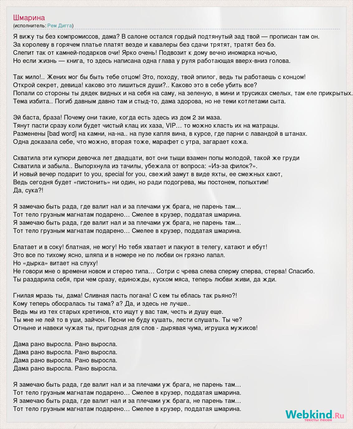 Я вижу ты без компромиссов, дама? В салоне остался гордый подтянутый зад твой — прописан там он. За королеву в горячем платье платят везде и кавалеры без сдачи трятят, тратят без бэ. Слепит так от камней-подарков очи! Ярко очень! Подвозит к дому вечно иномарка ночью, Но если жизнь — книга, то здесь написана одна глава у руля работающая вверх-вниз голова. Так мило!.. Жених мог бы быть тебе отцом! Это, походу, твой эпилог, ведь ты работаешь с концом! Открой секрет, девица! каково это лишиться души?.. Каково это в себе убить все? Попали со стороны ты дядек видных и на себя на саму, на зеленую, в мини и трусиках смелых, там еле прикрытых. Тема избита.. Погиб давным давно там и стыд-то, дама здорова, но не теми котлетами сыта. Эй баста, браза! Почему они такие, когда есть здесь из дом 2 зи маза. Тянут пасти сразу коли будет чистый клац их хаза, VIP… то можно класть их на матрацы. Разменены [bad word] на камни, на-на.. на пузе капля вина, в курсе, где парни с лавандой в штанах. Одна доказала себе, что можно, вторая тоже, марафет с утра, загарает кожа. Схватила эти купюри девочка лет двадцати, вот они тыщи взамен попы молодой, такой же груди Схватила и забыла.. Выпорхнула из тачилы, убежала от вопроса: «Из-за филок?». И новый вечер подарит to you, special for you, свежий замут в виде яхты, ее смежных кают, Ведь сегодня будет «пистонить» ни один, но ради подогрева, мы постонем, попыхтим! Да, сука?! Я замечаю быть рада, где валит нал и за плечами уж брага, не парень там… Тот тело грузным магнатам подарено… Смелее в крузер, поддатая шмарина. Я замечаю быть рада, где валит нал и за плечами уж брага, не парень там… Тот тело грузным магнатам подарено… Смелее в крузер, поддатая шмарина. Блатает и в соку! блатная, не могу! Но тебя хватает и пакуют в телегу, катают и ебут! Это все по тихому ясно, шляпа и в номере не по любви он грязно лапал. Но «дырка» витает на слуху! Не говори мне о времени новом и стерео типа… Сотри с чрева слева сперму сперва, стерва! Спасибо. Ты раздарила себя, при чем сразу, единожды, куском мяса, теперь любви живи, да жди. Гнилая мразь ты, дама! Сливная пасть погана! С кем ты еблась так рьяно?! Кому теперь обосралась ты тама? а? Да, и здесь не лучше.. Ведь мы из тех старых кретинов, кто ищут у вас там, честь и душу еще. Ты мне не лей то в уши, зайчон. Песни не буду кушать, лести слушать. Ты че? Отныне и навеки чужая ты, пригодная для слов - дырявая чума, игрушка мужиков! Дама рано выросла. Рано выросла. Дама рано выросла. Рано выросла. Дама рано выросла. Рано выросла. Дама рано выросла. Рано выросла. Я замечаю быть рада, где валит нал и за плечами уж брага, не парень там… Тот тело грузным магнатам подарено… Смелее в крузер, поддатая шмарина. Я замечаю быть рада, где валит нал и за плечами уж брага, не парень там… Тот тело грузным магнатам подарено… Смелее в крузер, поддатая шмарина.