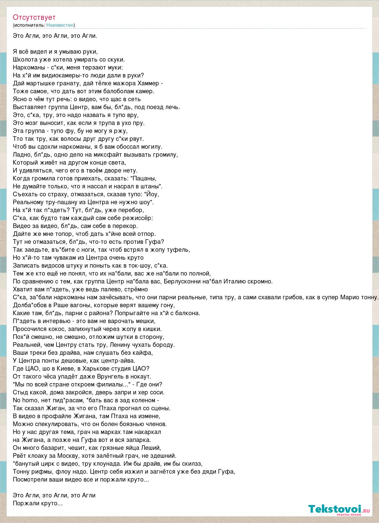 Это Агли, это Агли, это Агли. Я всё видел и я умываю руки, Школота уже хотела умирать со скуки. Наркоманы - с*ки, меня терзают муки: На х*й им видиокамеры-то люди дали в руки? Дай мартышке гранату, дай тёлке мажора Хаммер - Тоже самое, что дать вот этим балоболам камер. Ясно о чём тут речь: о видео, что щас в сеть Выставляет группа Центр, вам бы, бл*дь, под поезд лечь. Это, с*ка, тру, это надо назвать я тупо вру, Это мозг выносит, как если я трупа в ухо пру. Эта группа - тупо фу, бу не могу я ржу, Тто так тру, как волосы друг другу с*ки рвут. Чтоб вы сдохли наркоманы, я б вам обоссал могилу. Ладно, бл*дь, одно дело на миксфайт вызывать громилу, Который живёт на другом конце света, И удивляться, чего его в твоём дворе нету. Когда громила готов приехать, сказать: "Пацаны, Не думайте только, что я нассал и насрал в штаны". Съехать со страху, отмазаться, сказав тупо: "Йоу, Реальному тру-пацану из Центра не нужно шоу". На х*й так п*здеть? Тут, бл*дь, уже перебор, С*ка, как будто там каждый сам себе режиссёр: Видео за видео, бл*дь, сам себе в перекор. Дайте же мне топор, чтоб дать х*йне всей отпор. Тут не отмазаться, бл*дь, что-то есть против Гуфа? Так заедьте, въ*бите с ноги, так чтоб встрял в жопу туфель, Но х*й-то там чувакам из Центра очень круто Записать видосов штуку и поныть как в ток-шоу, с*ка. Тем же кто ещё не понял, что их на*бали, вас же на*бали по полной, По сравнению с тем, как группа Центр на*бала вас, Берлусконни на*бал Италию скромно. Хватит вам п*здеть, уже ведь палево, стрёмно С*ка, за*бали наркоманы нам зачёсывать, что они парни реальные, типа тру, а сами схавали грибов, как в супер Марио тонну. Долба*обов в Раше вагоны, которые верят вашему гону, Какие там, бл*дь, парни с района? Попрыгайте на х*й с балкона. П*здеть в интервью - это вам не варочать мешки, Просочился кокос, запихнутый через жопу в кишки. Пох*й смешно, не смешно, отложим шутки в сторону, Реальней, чем Центру стать тру, Ленину чухать бороду. Ваши треки без драйва, нам слушать без кайфа, У Центра понты дешовые, как центр-айва. Где ЦАО, шо в Киеве, в Харькове студия ЦАО? От такого чёса упадёт даже Врунгель в нокаут. "Мы по всей стране откроем филиалы..." - Где они? Стыд какой, дома закройся, дверь запри и хер соси. No homo, нет пид*расам, *бать вас в зад коленом - Так сказал Жиган, за что его Птаха прогнал со сцены. В видео в профайле Жигана, там Птаха на измене, Можно спекулировать, что он болен боязнью членов. Но у нас другая тема, грач на марках там накаркал на Жигана, а позже на Гуфа вот и вся запарка. Он много базарит, чешит, как грязные яйца Леший, Рвёт клоаку за Москву, хотя залётный грач, не здешний. *банутый цирк с видео, тру клоунада. Им бы драйв, им бы скилзз, Тонну рифмы, флоу надо. Центр себя изжил и загнётся уже без дяди Гуфа, Посмотрели ваши видео все и поржали круто... Это Агли, это Агли, это Агли Поржали круто...