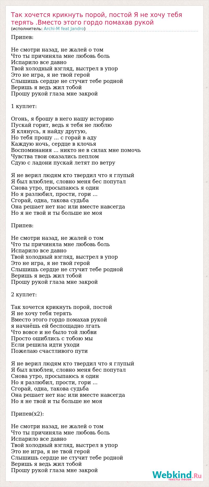 Припев: Не смотри назад, не жалей о том Что ты причиняла мне любовь боль Испарило все давно Твой холодный взгляд, выстрел в упор Это не игра, я не твой герой Слышишь сердце не стучит тебе родной Веришь я ведь жил тобой Прошу рукой глаза мне закрой 1 куплет: Огонь, я брошу в него нашу историю Пускай горит, ведь я тебя не люблю Я клянусь, я найду другую, Но тебя прошу ... с горай в аду Каждую ночь, сердце в клочья Воспоминания ... никто не в силах мне помочь Чувства твои оказались пеплом Сдую с ладони пускай летят по ветру Я не верил людям кто твердил что я глупый Я был влюблен, словно меня бес попутал Снова утро, просыпаюсь я один Но я разлюбил, прости, гори ... Сгорай, одна, такова судьба Она решает нет нас или вместе навсегда Но я не твой и ты больше не моя Припев: Не смотри назад, не жалей о том Что ты причиняла мне любовь боль Испарило все давно Твой холодный взгляд, выстрел в упор Это не игра, я не твой герой Слышишь сердце не стучит тебе родной Веришь я ведь жил тобой Прошу рукой глаза мне закрой 2 куплет: Так хочется крикнуть порой, постой Я не хочу тебя терять Вместо этого гордо помахав рукой я начнёшь ей беспощадно лгать Что вовсе и не было той любви Просто ошиблись с тобою мы Если решила идти уходи Пожелаю счастливого пути Я не верил людям кто твердил что я глупый Я был влюблен, словно меня бес попутал Снова утро, просыпаюсь я один Но я разлюбил, прости, гори ... Сгорай, одна, такова судьба Она решает нет нас или вместе навсегда Но я не твой и ты больше не моя Припев(x2): Не смотри назад, не жалей о том Что ты причиняла мне любовь боль Испарило все давно Твой холодный взгляд, выстрел в упор Это не игра, я не твой герой Слышишь сердце не стучит тебе родной Веришь я ведь жил тобой Прошу рукой глаза мне закрой