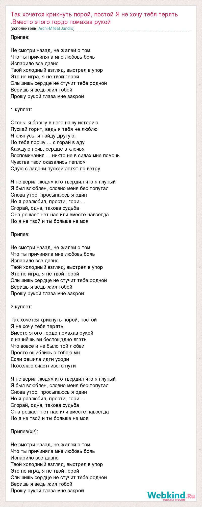 Припев: Не смотри назад, не жалей о том Что ты причиняла мне любовь боль Испарило все давно Твой холодный взгляд, выстрел в упор Это не игра, я не твой герой Слышишь сердце не стучит тебе родной Веришь я ведь жил тобой Прошу рукой глаза мне закрой 1 куплет: Огонь, я брошу в него нашу историю Пускай горит, ведь я тебя не люблю Я клянусь, я найду другую, Но тебя прошу ... с горай в аду Каждую ночь, сердце в клочья Воспоминания ... никто не в силах мне помочь Чувства твои оказались пеплом Сдую с ладони пускай летят по ветру Я не верил людям кто твердил что я глупый Я был влюблен, словно меня бес попутал Снова утро, просыпаюсь я один Но я разлюбил, прости, гори ... Сгорай, одна, такова судьба Она решает нет нас или вместе навсегда Но я не твой и ты больше не моя Припев: Не смотри назад, не жалей о том Что ты причиняла мне любовь боль Испарило все давно Твой холодный взгляд, выстрел в упор Это не игра, я не твой герой Слышишь сердце не стучит тебе родной Веришь я ведь жил тобой Прошу рукой глаза мне закрой 2 куплет: Так хочется крикнуть порой, постой Я не хочу тебя терять Вместо этого гордо помахав рукой я начнёшь ей беспощадно лгать Что вовсе и не было той любви Просто ошиблись с тобою мы Если решила идти уходи Пожелаю счастливого пути Я не верил людям кто твердил что я глупый Я был влюблен, словно меня бес попутал Снова утро, просыпаюсь я один Но я разлюбил, прости, гори ... Сгорай, одна, такова судьба Она решает нет нас или вместе навсегда Но я не твой и ты больше не моя Припев(x2): Не смотри назад, не жалей о том Что ты причиняла мне любовь боль Испарило все давно Твой холодный взгляд, выстрел в упор Это не игра, я не твой герой Слышишь сердце не стучит тебе родной Веришь я ведь жил тобой Прошу рукой глаза мне закрой