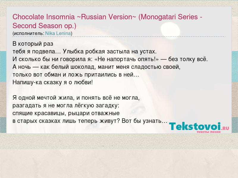 Главная→Исполнители→Nika Lenina→Chocolate Insomnia ~Russian Version~ (Monogatari Series - Second Season