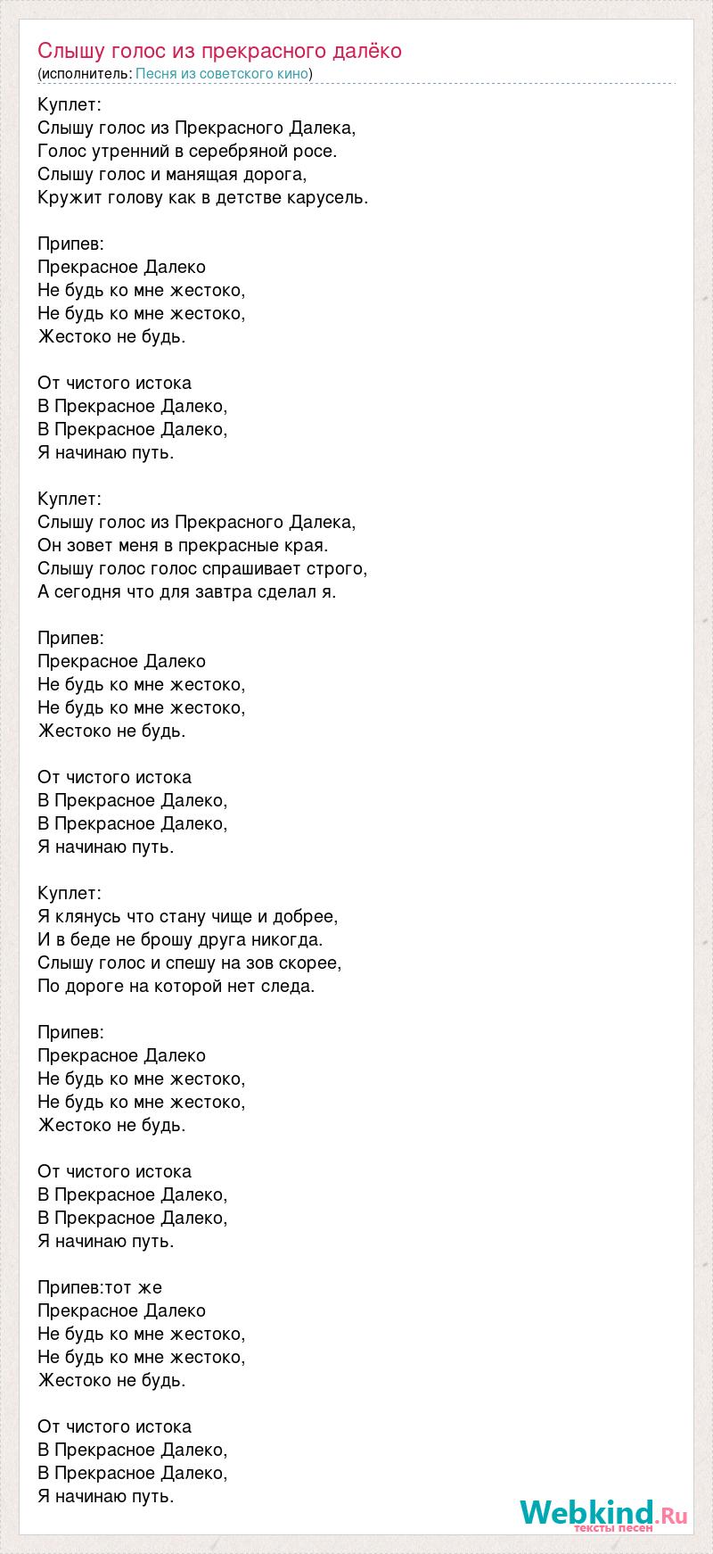 Куплет: Слышу голос из Прекрасного Далека, Голос утренний в серебряной росе. Слышу голос и манящая дорога, Кружит голову как в детстве карусель. Припев: Прекрасное Далеко Не будь ко мне жестоко, Не будь ко мне жестоко, Жестоко не будь. От чистого истока В Прекрасное Далеко, В Прекрасное Далеко, Я начинаю путь. Куплет: Слышу голос из Прекрасного Далека, Он зовет меня в прекрасные края. Слышу голос голос спрашивает строго, А сегодня что для завтра сделал я. Припев: Прекрасное Далеко Не будь ко мне жестоко, Не будь ко мне жестоко, Жестоко не будь. От чистого истока В Прекрасное Далеко, В Прекрасное Далеко, Я начинаю путь. Куплет: Я клянусь что стану чище и добрее, И в беде не брошу друга никогда. Слышу голос и спешу на зов скорее, По дороге на которой нет следа. Припев: Прекрасное Далеко Не будь ко мне жестоко, Не будь ко мне жестоко, Жестоко не будь. От чистого истока В Прекрасное Далеко, В Прекрасное Далеко, Я начинаю путь. Припев:тот же Прекрасное Далеко Не будь ко мне жестоко, Не будь ко мне жестоко, Жестоко не будь. От чистого истока В Прекрасное Далеко, В Прекрасное Далеко, Я начинаю путь.