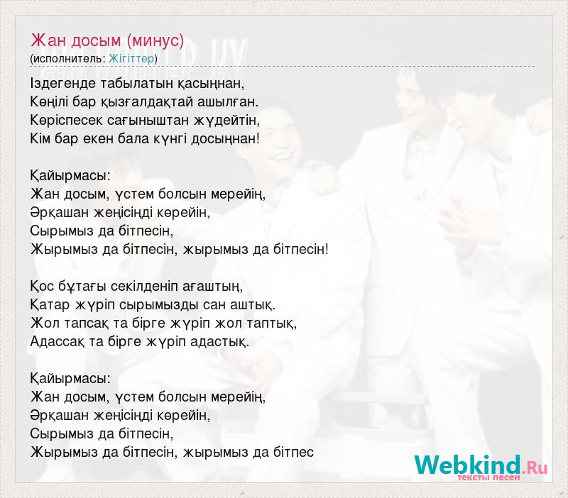 Iздегенде табылатын қасыңнан, Көңілі бар қызғалдақтай ашылған. Көрiспесек сағыныштан жүдейтiн, Кiм бар екен бала күнгi досыңнан! Қайырмасы: Жан досым, үстем болсын мерейің, Әрқашан жеңiсiңді көрейiн, Сырымыз да бiтпесiн, Жырымыз да бiтпесiн, жырымыз да бiтпесiн! Қос бұтағы секiлденiп ағаштың, Қатар жүріп сырымызды сан аштық. Жол тапсақ та бiрге жүрiп жол таптық, Адассақ та бiрге жүрiп адастық. Қайырмасы: Жан досым, үстем болсын мерейің, Әрқашан жеңiсiңді көрейiн, Сырымыз да бiтпесiн, Жырымыз да бiтпесiн, жырымыз да бiтпес