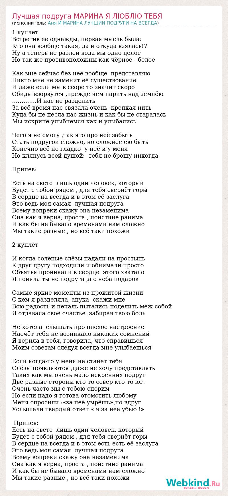 1 куплет Встретив её однажды, первая мысль была: Кто она вообще такая, да и откуда взялась!? Ну а теперь не разлей вода мы одно целое Но так же противоположны как чёрное - белое Как мне сейчас без неё вообще представляю Никто мне не заменит её существование И даже если мы в ссоре то значит скоро Обиды взорвутся ,прежде чем парить над землёю ………….И нас не разделить За всё время нас связала очень крепкая нить Куда бы не несла нас жизнь и как бы не старалась Мы искрине улыбнёмся как и улыбались Чего я не смогу ,так это про неё забыть Стать подругой сложно, но сложнее ею быть Конечно всё не гладко у неё и у меня Но клянусь всей душой: тебя не брошу никогда Припев: Есть на свете лишь один человек, который Будет с тобой рядом , для тебя свернёт горы В сердце на всегда и в этом её заслуга Это ведь моя самая лучшая подруга Всему вопреки скажу она незаменима Она как я верна, проста , поистине ранима И как бы не бывало временами нам сложно Мы такие разные , но всё таки похожи 2 куплет И когда солёные слёзы падали на простынь К друг другу подходили и обнимали просто Объятья проникали в сердце этого хватало Я поняла ты не подруга ,а с неба подарок Самые яркие моменты из прожитой жизни С кем я разделяла, анука скажи мне Всю радость и печаль пытались поделить меж собой Я отдавала своё счастье ,забирая твою боль Не хотела слышать про плохое настроение Насчёт тебя не возникало никаких сомнений Я верила в тебя, говорила, что справишься Моим советам следуя всегда мне улыбаешься Если когда-то у меня не станет тебя Слёзы появляются ,даже не хочу представлять Таких как мы очень мало искренних подруг Две разные стороны кто-то север кто-то юг. Очень часто мы с тобою спорим Но если надо я готова отомстить любому Меня спросили :«за неё умрёшь»,но вдруг Услышали твёрдый ответ « я за неё убью !» Припев: Есть на свете лишь один человек, который Будет с тобой рядом , для тебя свернёт горы В сердце на всегда и в этом есть есть её заслуга Это ведь моя самая лучшая подруга Всему вопреки скажу она незаменима Она как я верна, проста , поистине ранима И как бы не бывало временами нам сложно Мы такие разные , но всё таки похожи