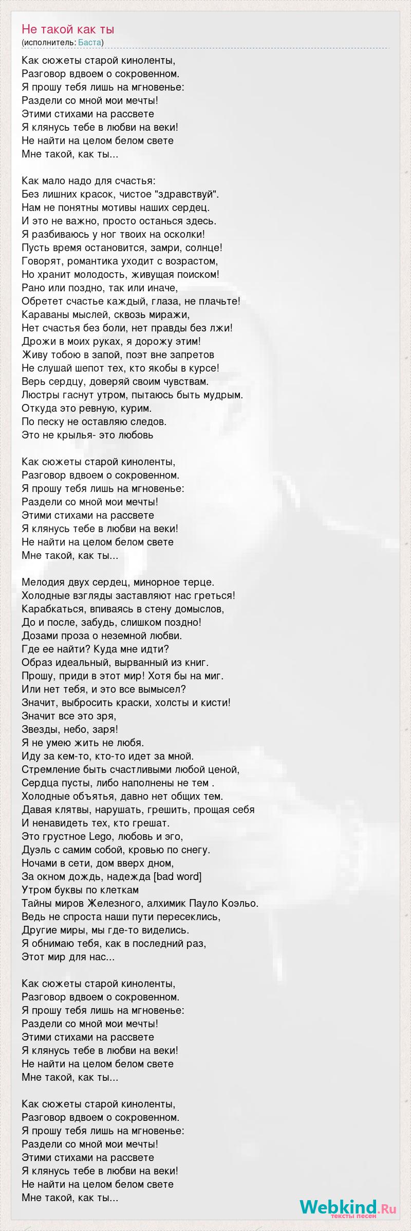 Как сюжеты старой киноленты, Разговор вдвоем о сокровенном. Я прошу тебя лишь на мгновенье: Раздели со мной мои мечты! Этими стихами на рассвете Я клянусь тебе в любви на веки! Не найти на целом белом свете Мне такой, как ты... Как мало надо для счастья: Без лишних красок, чистое "здравствуй". Нам не понятны мотивы наших сердец. И это не важно, просто останься здесь. Я разбиваюсь у ног твоих на осколки! Пусть время остановится, замри, солнце! Говорят, романтика уходит с возрастом, Но хранит молодость, живущая поиском! Рано или поздно, так или иначе, Обретет счастье каждый, глаза, не плачьте! Караваны мыслей, сквозь миражи, Нет счастья без боли, нет правды без лжи! Дрожи в моих руках, я дорожу этим! Живу тобою в запой, поэт вне запретов Не слушай шепот тех, кто якобы в курсе! Верь сердцу, доверяй своим чувствам. Люстры гаснут утром, пытаюсь быть мудрым. Откуда это ревную, курим. По песку не оставляю следов. Это не крылья- это любовь Как сюжеты старой киноленты, Разговор вдвоем о сокровенном. Я прошу тебя лишь на мгновенье: Раздели со мной мои мечты! Этими стихами на рассвете Я клянусь тебе в любви на веки! Не найти на целом белом свете Мне такой, как ты... Мелодия двух сердец, минорное терце. Холодные взгляды заставляют нас греться! Карабкаться, впиваясь в стену домыслов, До и после, забудь, слишком поздно! Дозами проза о неземной любви. Где ее найти? Куда мне идти? Образ идеальный, вырванный из книг. Прошу, приди в этот мир! Хотя бы на миг. Или нет тебя, и это все вымысел? Значит, выбросить краски, холсты и кисти! Значит все это зря, Звезды, небо, заря! Я не умею жить не любя. Иду за кем-то, кто-то идет за мной. Стремление быть счастливыми любой ценой, Сердца пусты, либо наполнены не тем . Холодные объятья, давно нет общих тем. Давая клятвы, нарушать, грешить, прощая себя И ненавидеть тех, кто грешат. Это грустное Lego, любовь и эго, Дуэль с самим собой, кровью по снегу. Ночами в сети, дом вверх дном, За окном дождь, надежда [bad word] Утром буквы по клеткам Тайны миров Железного, алхимик Пауло Коэльо. Ведь не спроста наши пути пересеклись, Другие миры, мы где-то виделись. Я обнимаю тебя, как в последний раз, Этот мир для нас... Как сюжеты старой киноленты, Разговор вдвоем о сокровенном. Я прошу тебя лишь на мгновенье: Раздели со мной мои мечты! Этими стихами на рассвете Я клянусь тебе в любви на веки! Не найти на целом белом свете Мне такой, как ты... Как сюжеты старой киноленты, Разговор вдвоем о сокровенном. Я прошу тебя лишь на мгновенье: Раздели со мной мои мечты! Этими стихами на рассвете Я клянусь тебе в любви на веки! Не найти на целом белом свете Мне такой, как ты...