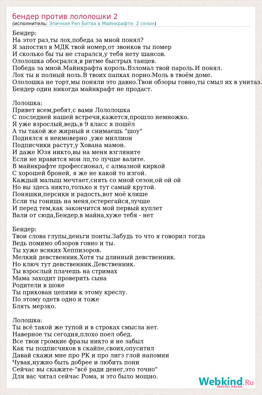 Бендер: На этот раз,ты лох,победа за мной понял? Я запостил в МДК твой номер,от звонков ты помер И сколько бы ты не старался,у тебя нету шансов. Ололошка обосрался,в ритме быстрых танцев. Победа за мной.Майнкрафта король.Взломал твой пароль.И понял. Лох ты и полный ноль.В твоих папках порно.Моль в твоём доме. Ололошка не торт,мы поняли это давно.Твои обзоры говно,ты смыл их в унитаз. Бендер один никогда майнкрафт не продаст. Лолошка: Привет всем,ребят,с вами Лололошка С последней нашей встречи,кажется,прошло немножко. Я уже взрослый,ведь,в 9 класс я пошёл А ты такой же жирный и снимаешь "шоу" Поднялся я неимоверно ,уже миллион Подписчики растут,у Хована мамон. И даже Юзя никто,вы на меня взгляните Если не нравится мои лп,то лучше валите. В майнкрафте профессионал, с алмазной киркой С хорошей броней, я же не какой то изгой. Каждый малыш мечтает,снять со мной сезон,ой ой ой Но вы здесь никто,только я тут самый крутой. Поняшки,персики и радость,вот моё клише Если ты гонишь на меня,остерегайся,лучше И перед тем,как закончится мой первый куплет Вали от сюда,Бендер,в майна,хуже тебя - нет Бендер: Твои слова глупы,деньги понты.Забудь то что я говорил тогда Ведь помимо обзоров говно и ты. Ты хуже всяких Хеппизоров. Мелкий девственник.Хотя ты длинный девственник. Но ключ тут девственник.Девственник. Ты взрослый плачешь на стримах Мама заходит проверить сына Родители в шоке Ты прикован цепями к этому креслу. По этому одетв одно и тоже Блять мерзко. Лолошка: Ты всё такой же тупой и в строках смысла нет. Наверное ты сегодня,плохо поел обед. Все твои громкие фразы никто и не забыл Как ты подписчиков в скайпе,своих,опуситил Давай скажи мне про РК и про лигз глой напомни Чувак,нужно быть добрее и любить пони Сейчас вы скажите-"всё ради денег,это точно" Для вас читал сейчас Рома, и это было мощно.