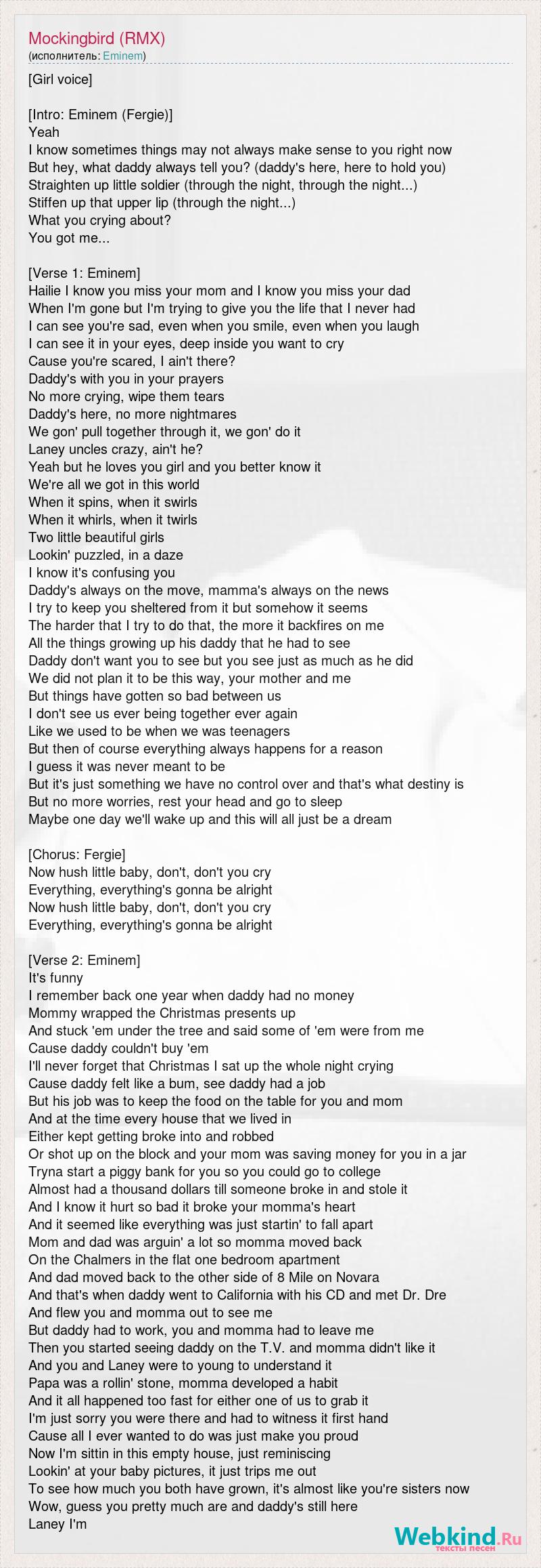 [Girl voice] [Intro: Eminem (Fergie)] Yeah I know sometimes things may not always make sense to you right now But hey, what daddy always tell you? (daddy's here, here to hold you) Straighten up little soldier (through the night, through the night...) Stiffen up that upper lip (through the night...) What you crying about? You got me... [Verse 1: Eminem] Hailie I know you miss your mom and I know you miss your dad When I'm gone but I'm trying to give you the life that I never had I can see you're sad, even when you smile, even when you laugh I can see it in your eyes, deep inside you want to cry Cause you're scared, I ain't there? Daddy's with you in your prayers No more crying, wipe them tears Daddy's here, no more nightmares We gon' pull together through it, we gon' do it Laney uncles crazy, ain't he? Yeah but he loves you girl and you better know it We're all we got in this world When it spins, when it swirls When it whirls, when it twirls Two little beautiful girls Lookin' puzzled, in a daze I know it's confusing you Daddy's always on the move, mamma's always on the news I try to keep you sheltered from it but somehow it seems The harder that I try to do that, the more it backfires on me All the things growing up his daddy that he had to see Daddy don't want you to see but you see just as much as he did We did not plan it to be this way, your mother and me But things have gotten so bad between us I don't see us ever being together ever again Like we used to be when we was teenagers But then of course everything always happens for a reason I guess it was never meant to be But it's just something we have no control over and that's what destiny is But no more worries, rest your head and go to sleep Maybe one day we'll wake up and this will all just be a dream [Chorus: Fergie] Now hush little baby, don't, don't you cry Everything, everything's gonna be alright Now hush little baby, don't, don't you cry Everything, everything's gonna be alright [Verse 2: Eminem] It's funny I remember back one year when daddy had no money Mommy wrapped the Christmas presents up And stuck 'em under the tree and said some of 'em were from me Cause daddy couldn't buy 'em I'll never forget that Christmas I sat up the whole night crying Cause daddy felt like a bum, see daddy had a job But his job was to keep the food on the table for you and mom And at the time every house that we lived in Either kept getting broke into and robbed Or shot up on the block and your mom was saving money for you in a jar Tryna start a piggy bank for you so you could go to college Almost had a thousand dollars till someone broke in and stole it And I know it hurt so bad it broke your momma's heart And it seemed like everything was just startin' to fall apart Mom and dad was arguin' a lot so momma moved back On the Chalmers in the flat one bedroom apartment And dad moved back to the other side of 8 Mile on Novara And that's when daddy went to California with his CD and met Dr. Dre And flew you and momma out to see me But daddy had to work, you and momma had to leave me Then you started seeing daddy on the T.V. and momma didn't like it And you and Laney were to young to understand it Papa was a rollin' stone, momma developed a habit And it all happened too fast for either one of us to grab it I'm just sorry you were there and had to witness it first hand Cause all I ever wanted to do was just make you proud Now I'm sittin in this empty house, just reminiscing Lookin' at your baby pictures, it just trips me out To see how much you both have grown, it's almost like you're sisters now Wow, guess you pretty much are and daddy's still here Laney I'm