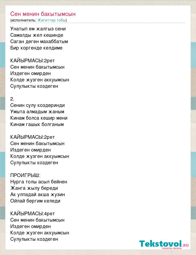 Унатып ем жалгыз сени Самалды жел кешинде Саган деген махаббатым Бир коргенде келдиме КАЙЫРМАСЫ:2рет Сен менин бакытымсын Издеген омирден Колде жузген аккуымсын Сулулыкты коздеген 2. Сенин сулу коздеринди Умыта алмадым жаным Кинам болса кешир мени Кинам гашык болганым КАЙЫРМАСЫ:2рет Сен менин бакытымсын Издеген омирден Колде жузген аккуымсын Сулулыкты коздеген ПРОИГРЫШ: Нурга толы асыл бейнен Жанга жылу береди Ак улпадай акша жузин Ойлай бергим келеди КАЙЫРМАСЫ:4рет Сен менин бакытымсын Издеген омирден Колде жузген аккуымсын Сулулыкты коздеген