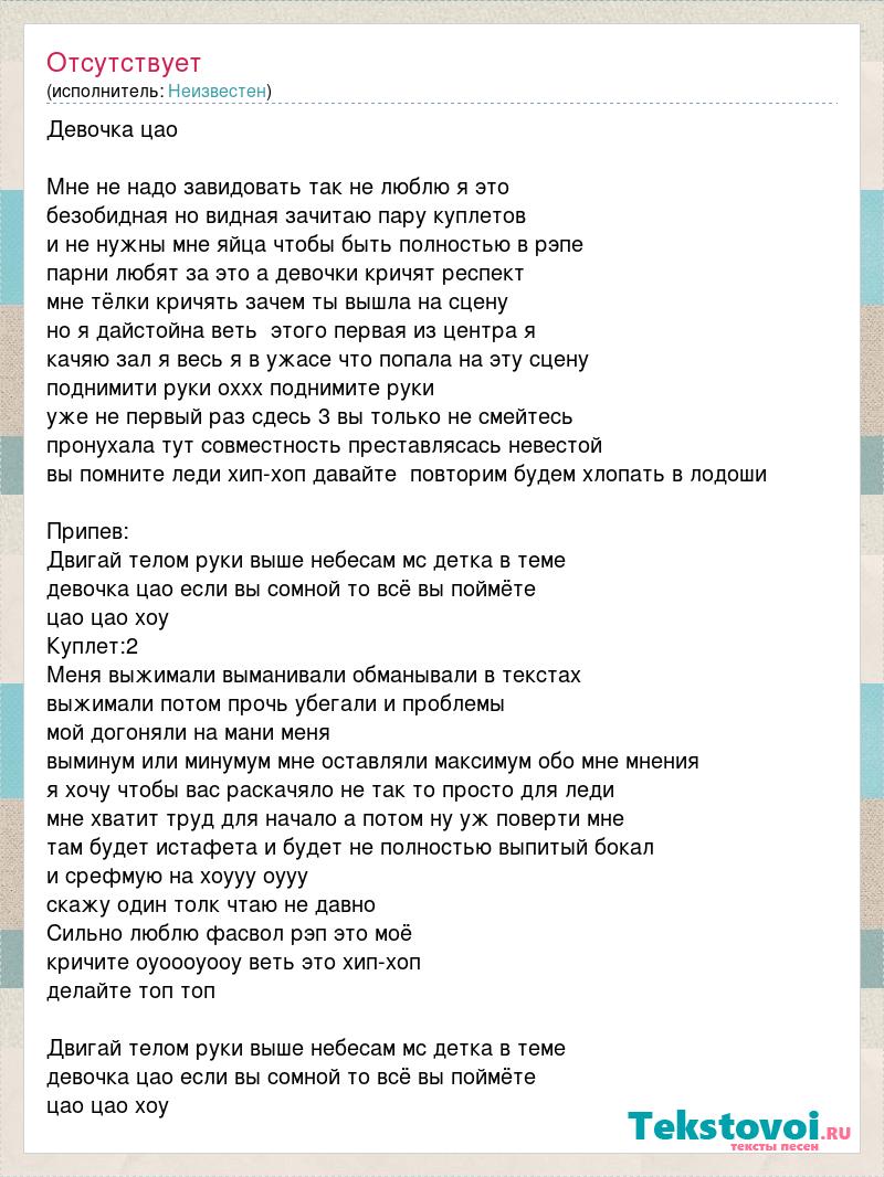 Девочка цао Мне не надо завидовать так не люблю я это безобидная но видная зачитаю пару куплетов и не нужны мне яйца чтобы быть полностью в рэпе парни любят за это а девочки кричят респект мне тёлки кричять зачем ты вышла на сцену но я дайстойна веть этого первая из центра я качяю зал я весь я в ужасе что попала на эту сцену поднимити руки оххх поднимите руки уже не первый раз сдесь 3 вы только не смейтесь пронухала тут совместность преставлясась невестой вы помните леди хип-хоп давайте повторим будем хлопать в лодоши Припев: Двигай телом руки выше небесам мс детка в теме девочка цао если вы сомной то всё вы поймёте цао цао хоу Куплет:2 Меня выжимали выманивали обманывали в текстах выжимали потом прочь убегали и проблемы мой догоняли на мани меня выминум или минумум мне оставляли максимум обо мне мнения я хочу чтобы вас раскачяло не так то просто для леди мне хватит труд для начало а потом ну уж поверти мне там будет истафета и будет не полностью выпитый бокал и срефмую на хоууу оууу скажу один толк чтаю не давно Сильно люблю фасвол рэп это моё кричите оуоооуооу веть это хип-хоп делайте топ топ Двигай телом руки выше небесам мс детка в теме девочка цао если вы сомной то всё вы поймёте цао цао хоу