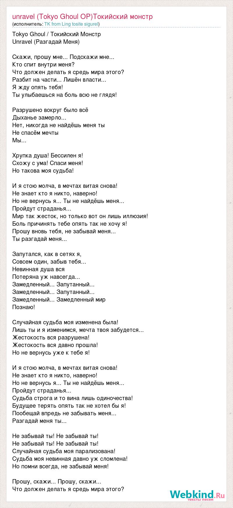 Tokyo Ghoul / Токийский Монстр Unravel (Разгадай Меня) Скажи, прошу мне... Подскажи мне... Кто спит внутри меня? Что должен делать я средь мира этого? Разбит на части... Лишён власти... Я жду опять тебя! Ты улыбаешься на боль всю не глядя! Разрушено вокруг было всё Дыханье замерло... Нет, никогда не найдёшь меня ты Не спасём мечты Мы... Хрупка душа! Бессилен я! Схожу с ума! Спаси меня! Но такова моя судьба! И я стою молча, в мечтах витая снова! Не знает кто я никто, наверно! Но не вернусь я... Ты не найдёшь меня... Пройдут страданья... Мир так жесток, но только вот он лишь иллюзия! Боль причинять тебе опять так не хочу я! Прошу вновь тебя, не забывай меня... Ты разгадай меня... Запутался, как в сетях я, Совсем один, забыв тебя... Невинная душа вся Потеряна уж навсегда... Замедленный... Запутанный... Замедленный... Запутанный... Замедленный... Замедленный мир Познаю! Случайная судьба моя изменена была! Лишь ты и я изменимся, мечта твоя забудется... Жестокость вся разрушена! Жестокость вся давно прошла! Но не вернусь уже к тебе я! И я стою молча, в мечтах витая снова! Не знает кто я никто, наверно! Но не вернусь я... Ты не найдёшь меня... Пройдут страданья... Судьба строга и то вина лишь одиночества! Будущее терять опять так не хотел бы я! Пообещай впредь не забывать меня... Разгадай меня ты... Не забывай ты! Не забывай ты! Не забывай ты! Не забывай ты! Случайная судьба моя парализована! Судьба моя невинная давно уж сломлена! Но помни всегда, не забывай меня! Прошу, скажи... Прошу, скажи... Что должен делать я средь мира этого?