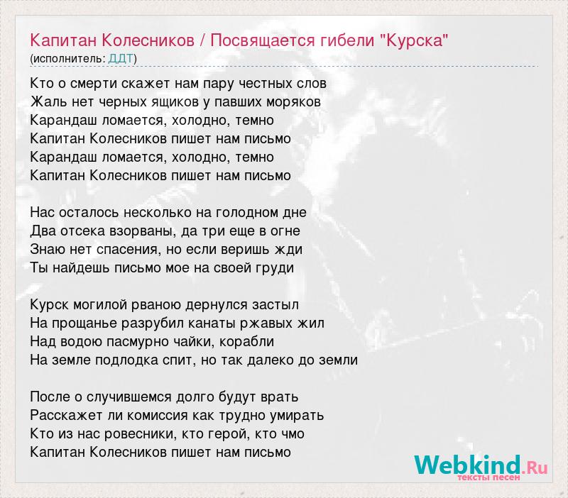 Кто о смерти скажет нам пару честных слов Жаль нет черных ящиков у павших моряков Карандаш ломается, холодно, темно Капитан Колесников пишет нам письмо Карандаш ломается, холодно, темно Капитан Колесников пишет нам письмо Нас осталось несколько на голодном дне Два отсека взорваны, да три еще в огне Знаю нет спасения, но если веришь жди Ты найдешь письмо мое на своей груди Курск могилой рваною дернулся застыл На прощанье разрубил канаты ржавых жил Над водою пасмурно чайки, корабли На земле подлодка спит, но так далеко до земли После о случившемся долго будут врать Расскажет ли комиссия как трудно умирать Кто из нас ровесники, кто герой, кто чмо Капитан Колесников пишет нам письмо
