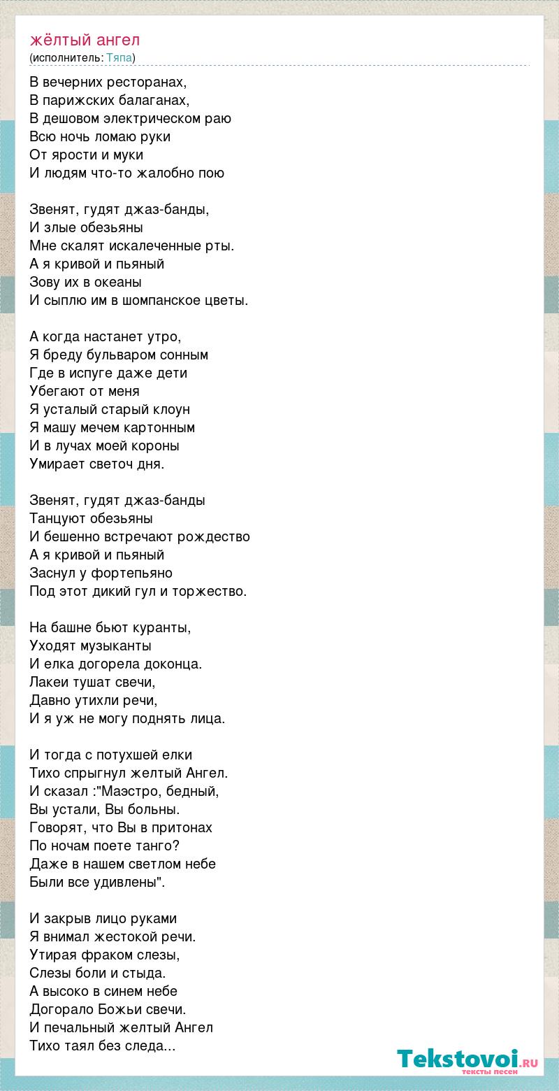В вечерних ресторанах, В парижских балаганах, В дешовом электрическом раю Всю ночь ломаю руки От ярости и муки И людям что-то жалобно пою Звенят, гудят джаз-банды, И злые обезьяны Мне скалят искалеченные рты. А я кривой и пьяный Зову их в океаны И сыплю им в шомпанское цветы. А когда настанет утро, Я бреду бульваром сонным Где в испуге даже дети Убегают от меня Я усталый старый клоун Я машу мечем картонным И в лучах моей короны Умирает светоч дня. Звенят, гудят джаз-банды Танцуют обезьяны И бешенно встречают рождество А я кривой и пьяный Заснул у фортепьяно Под этот дикий гул и торжество. На башне бьют куранты, Уходят музыканты И елка догорела доконца. Лакеи тушат свечи, Давно утихли речи, И я уж не могу поднять лица. И тогда с потухшей елки Тихо спрыгнул желтый Ангел. И сказал :"Маэстро, бедный, Вы устали, Вы больны. Говорят, что Вы в притонах По ночам поете танго? Даже в нашем светлом небе Были все удивлены". И закрыв лицо руками Я внимал жестокой речи. Утирая фраком слезы, Слезы боли и стыда. А высоко в синем небе Догорало Божьи свечи. И печальный желтый Ангел Тихо таял без следа...