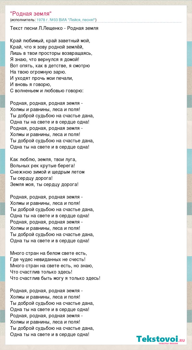 Текст песни Л.Лещенко - Родная земля Край любимый, край заветный мой, Край, что я зову родной землёй, Лишь в твои просторы возвращаясь, Я знаю, что вернулся я домой! Вот опять, как в детстве, я смотрю На твою огромную зарю. И уходят прочь мои печали, И вновь я говорю, С волненьем и любовью говорю: Родная, родная, родная земля - Холмы и равнины, леса и поля! Ты доброй судьбою на счастье дана, Одна ты на свете и в сердце одна! Родная, родная, родная земля - Холмы и равнины, леса и поля! Ты доброй судьбою на счастье дана, Одна ты на свете и в сердце одна! Как люблю, земля, твои луга, Вольных рек крутые берега! Снежною зимой и щедрым летом Ты сердцу дорога! Земля моя, ты сердцу дорога! Родная, родная, родная земля - Холмы и равнины, леса и поля! Ты доброй судьбою на счастье дана, Одна ты на свете и в сердце одна! Родная, родная, родная земля - Холмы и равнины, леса и поля! Ты доброй судьбою на счастье дана, Одна ты на свете и в сердце одна! Много стран на белом свете есть, Где чудес невиданных не счесть! Много стран на свете есть, но знаю, Что счастлив только здесь! Что счастлив быть могу я только здесь! Родная, родная, родная земля - Холмы и равнины, леса и поля! Ты доброй судьбою на счастье дана, Одна ты на свете и в сердце одна! Родная, родная, родная земля - Холмы и равнины, леса и поля! Ты доброй судьбою на счастье дана, Одна ты на свете и в сердце одна!