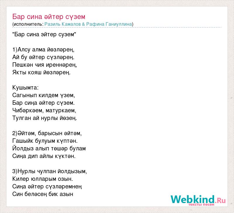 "Бар сина эйтер сузем" 1)Алсу алма йөзләрең, Ай бу әйтер сүзләрең. Пешкән чия иреннәрең, Якты кояш йөзләрең. Кушымта: Сагынып килдем үзем, Бар сиңа әйтер сүзем. Чибәркәем, матуркаем, Тулган ай нурлы йөзең. 2)Әйтәм, барысын әйтәм, Гашыйк булуым күптән. Йолдыз алып төшәр булам Сиңа дип айлы күктән. 3)Нурлы чулпан йолдызым, Килер юлларым озын. Сиңа әйтер сүзләремнең Син беләсең бик азын