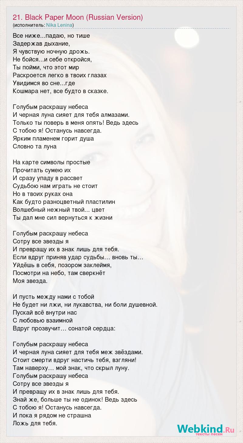 Все ниже...падаю, но тише Задержав дыхание, Я чувствую ночную дрожь. Не бойся...и себе откройся, Ты пойми, что этот мир Раскроется легко в твоих глазах Увидимся во сне...где Кошмара нет, все будто в сказке. Голубым раскрашу небеса И черная луна сияет для тебя алмазами. Только ты поверь в меня опять! Ведь здесь С тобою я! Останусь навсегда. Ярким пламенем горит душа Словно та луна На карте символы простые Прочитать сумею их И сразу упаду в рассвет Судьбою нам играть не стоит Но в твоих руках она Как будто разноцветный пластилин Волшебный нежный твой... цвет Ты дал мне сил вернуться к жизни Голубым раскрашу небеса Сотру все звезды я И превращу их в знак лишь для тебя. Если вдруг приняв удар судьбы… вновь ты… Уйдёшь в себя, позором заклеймя, Посмотри на небо, там сверкнёт Моя звезда. И пусть между нами с тобой Не будет ни лжи, ни лукавства, ни боли душевной. Пускай всё внутри нас С любовью взаимной Вдруг прозвучит… сонатой сердца: Голубым раскрашу небеса И черная луна сияет для тебя меж звёздами. Стоит смерти вдруг настичь тебя, взгляни! Там наверху… мой знак, что скрыл луну. Голубым раскрашу небеса Сотру все звезды я И превращу их в знак лишь для тебя. Знай же, больше ты не одинок! Ведь здесь С тобою я! Останусь навсегда. И пока я рядом не страшна Ложь для тебя.